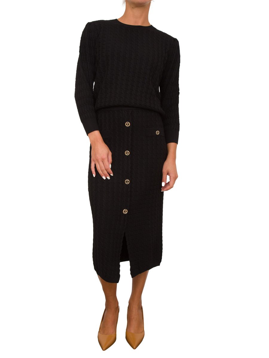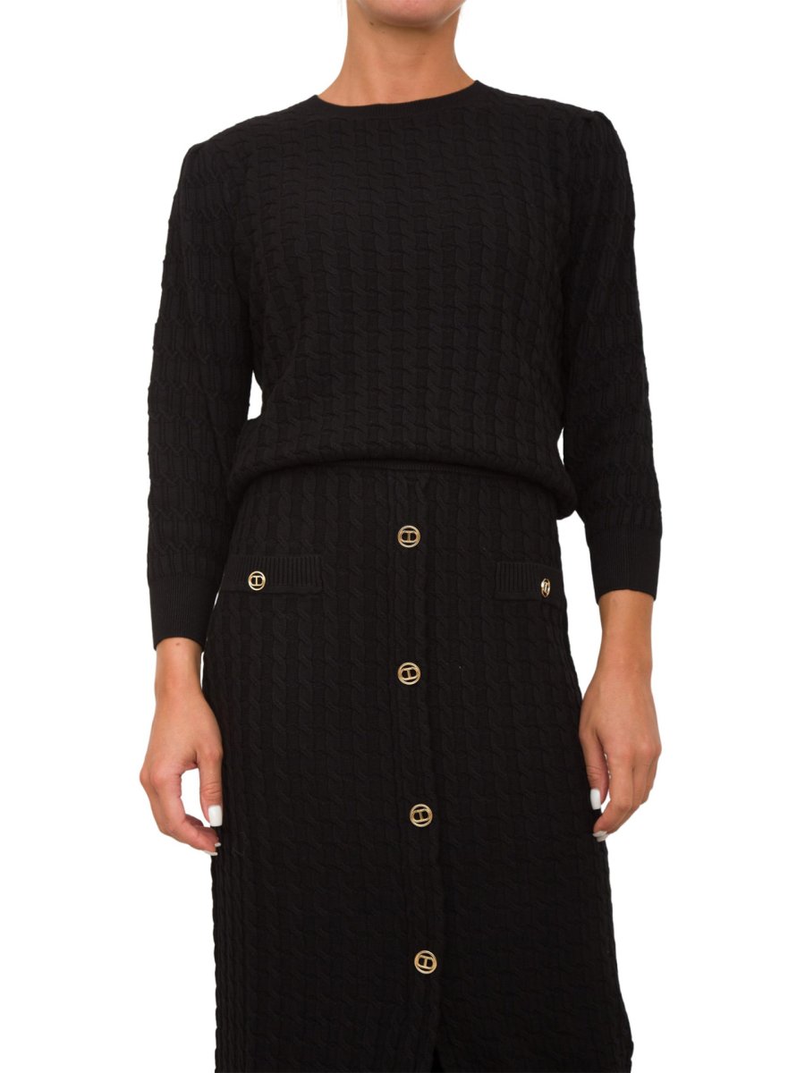 Свитер из смесовой вискозы стретч с трехмерным эффектом крестообразной строчки, круглый вырез горловины, длинные рукава, ребристая отделка, металлическая табличка с логотипом овальной формы на спине, мягкий крой.