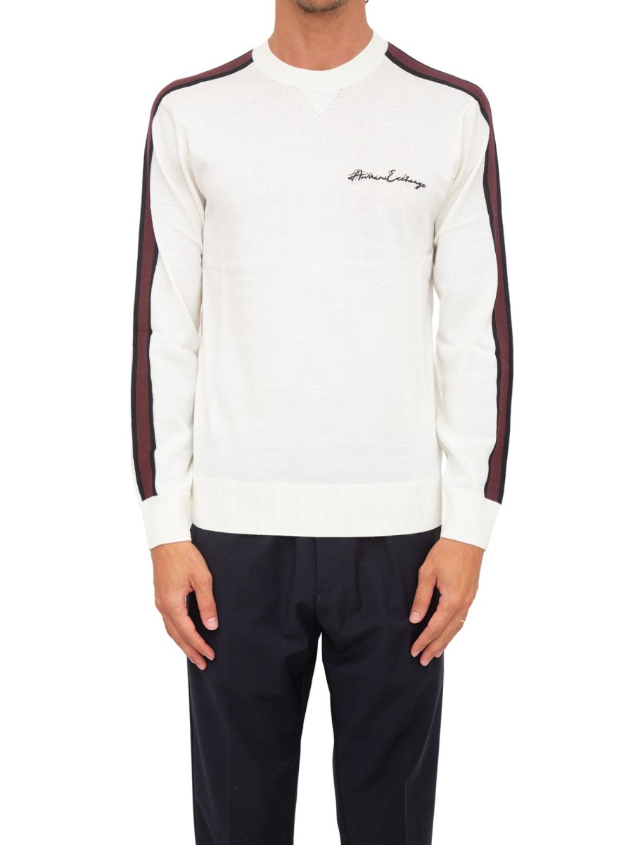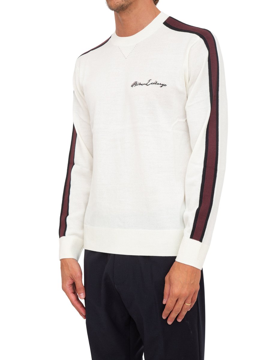 Maglione girocollo Armani Exchange realizzato in misto lana vergine con logo a contrasto sul petto e bande a contrasto sulle maniche.