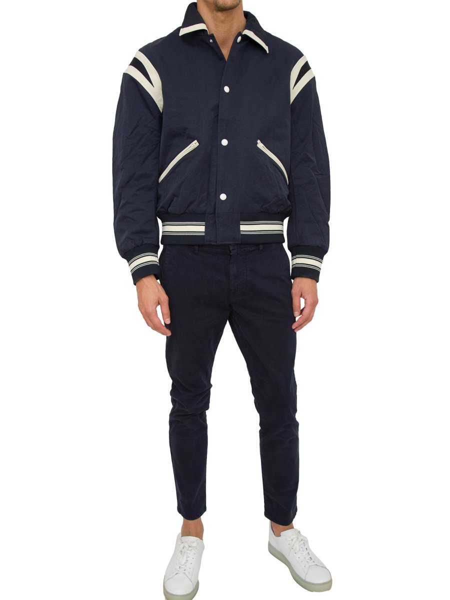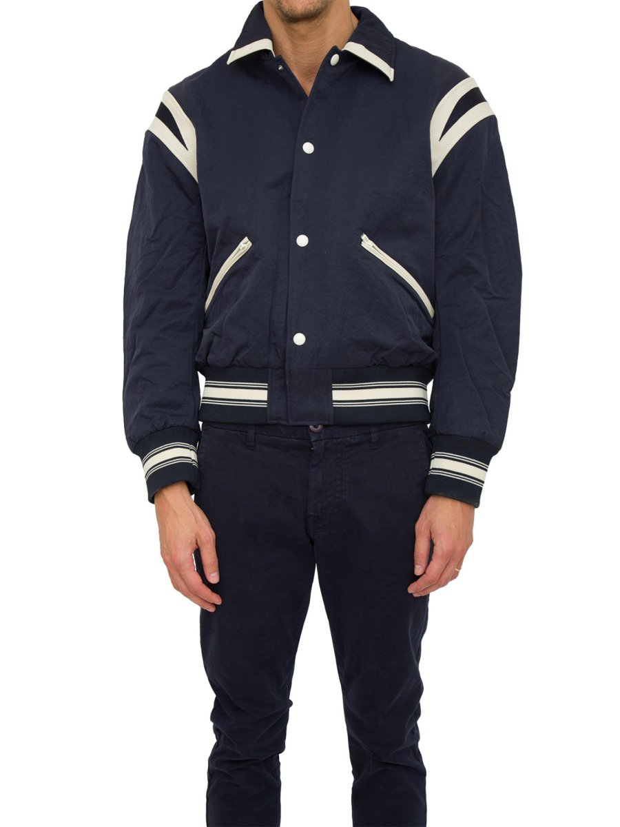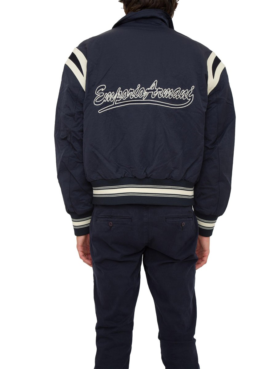 Bomberda uomo Emporio Armani provvisto di bottoni automatici di chiusura, dettagli in pelle a contrasto e ricamo logo sul retro. Un capo outerwear realizzato in 100% nylon crinkle.