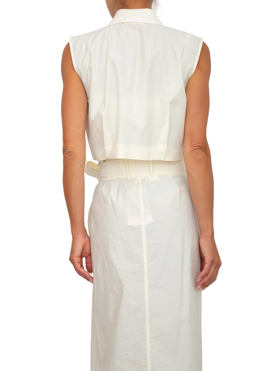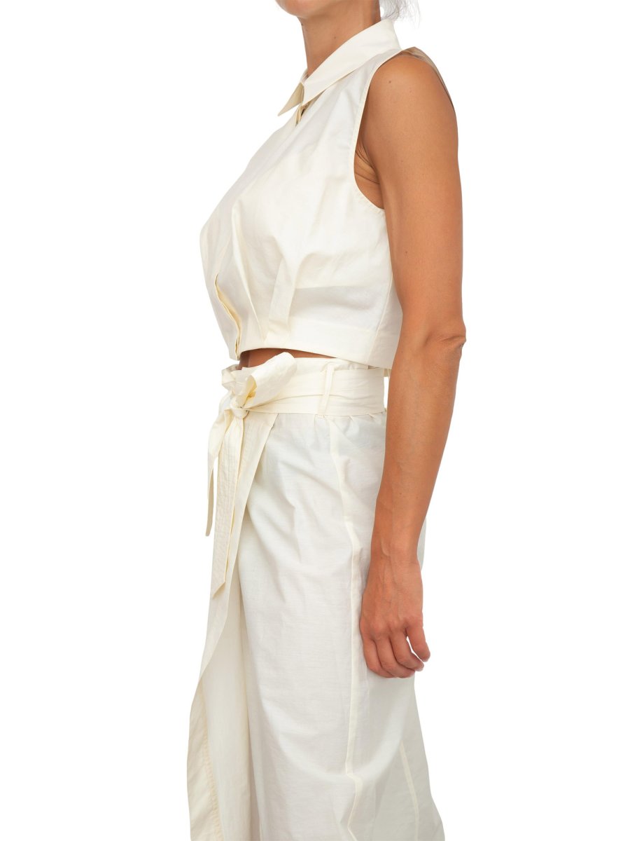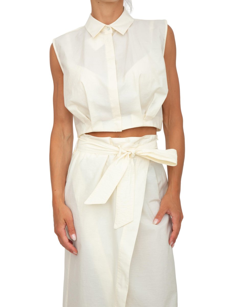 Укороченная рубашка iBlues из технической ткани с элегантным кроем, сборкой и складками по низу. Безрукавка с воротником и потайной застежкой на пуговицы, встречная складка на спине.