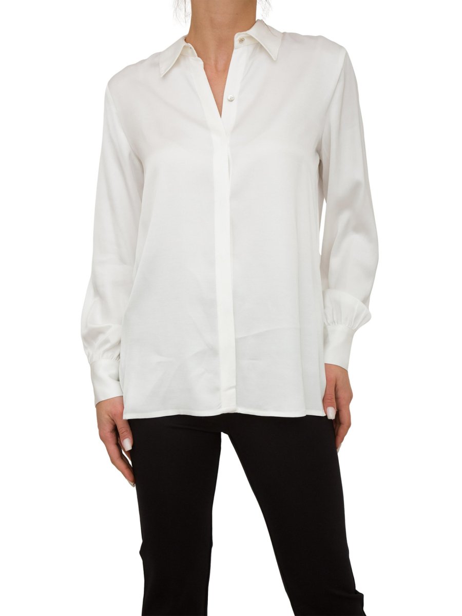 Camicia regular in raso, colletto classico, bottoni centrali nascosti per apertura, e con maniche lunghe.