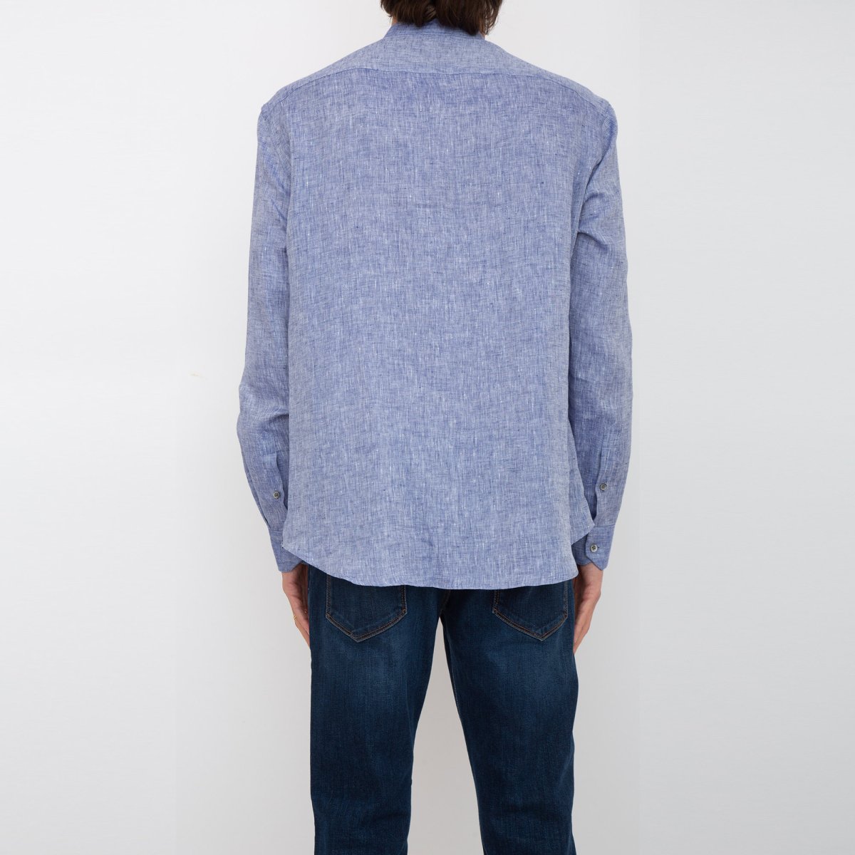 Camicia realizzata in lino/fibra di lino, batista, colletto alla coreana, falsatura frontale con abbottonatura, maniche lunghe, orli con bottone e orlo curvo.