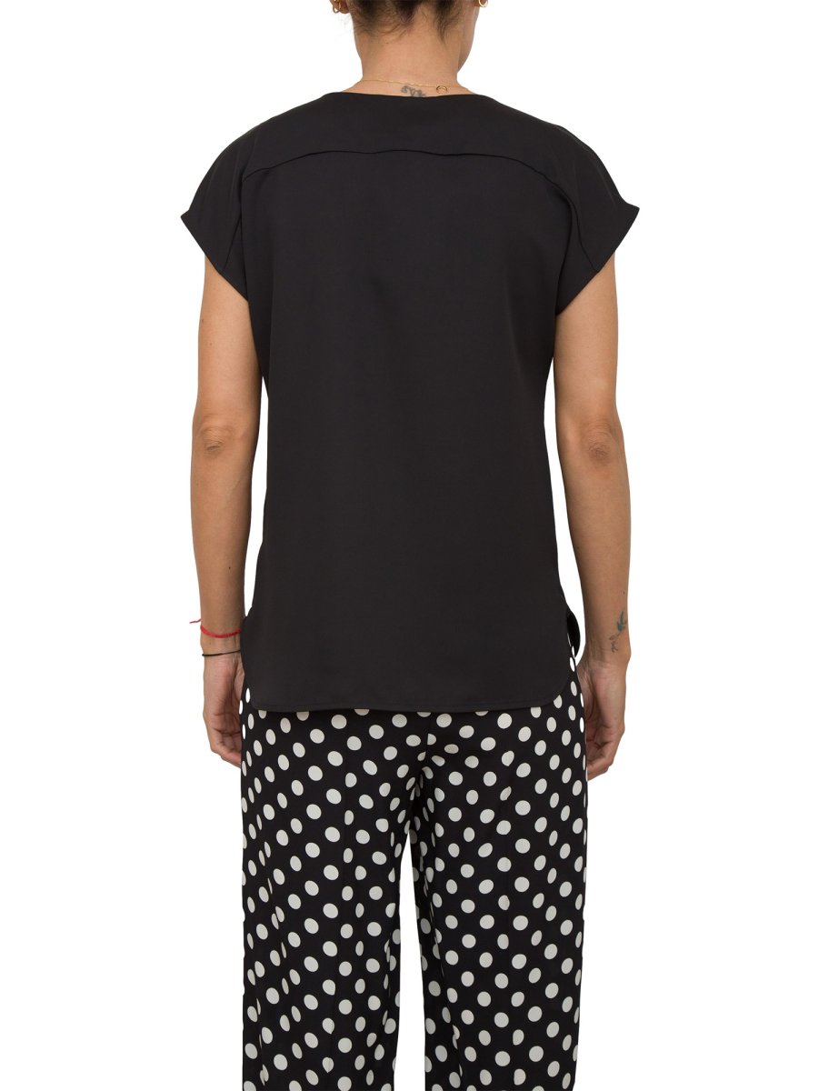 Блуза Marella из переработанного атласа, легкая и струящаяся, идеально подходит для создания изысканного и экологичного образа. Свободный крой элегантно подчеркивает силуэт, а V-образный вырез с приспущенным подолом и кокетка на спинке с подкладкой из жоржета добавляют изысканный штрих. Короткие рукава кимоно обеспечивают комфорт и стиль, что делает его идеальным для любого случая. Модель без подкладки, идеально подходит для межсезонья.