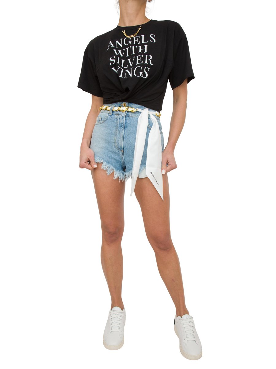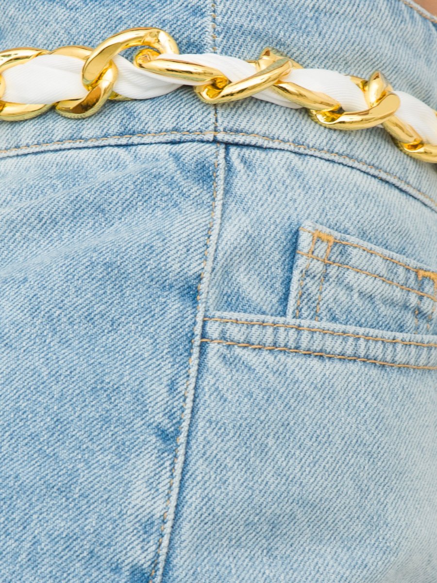 Shorts in denim a vita alta con fondi sfrangiati. Il punto vita è enfatizzato da un accessorio in catena e foulard infilato.