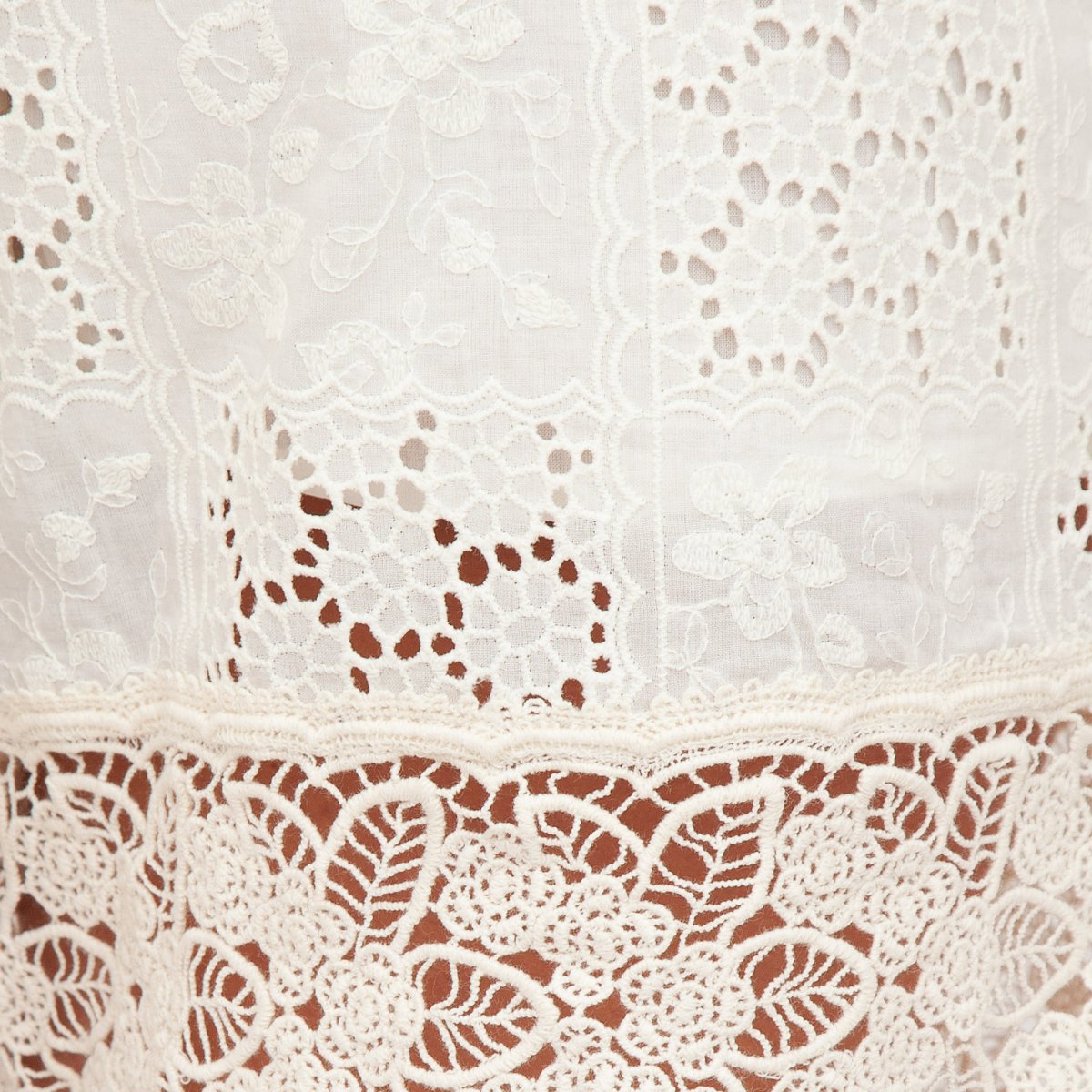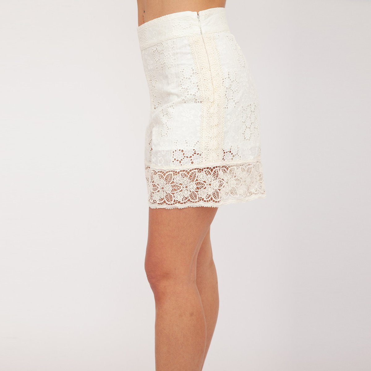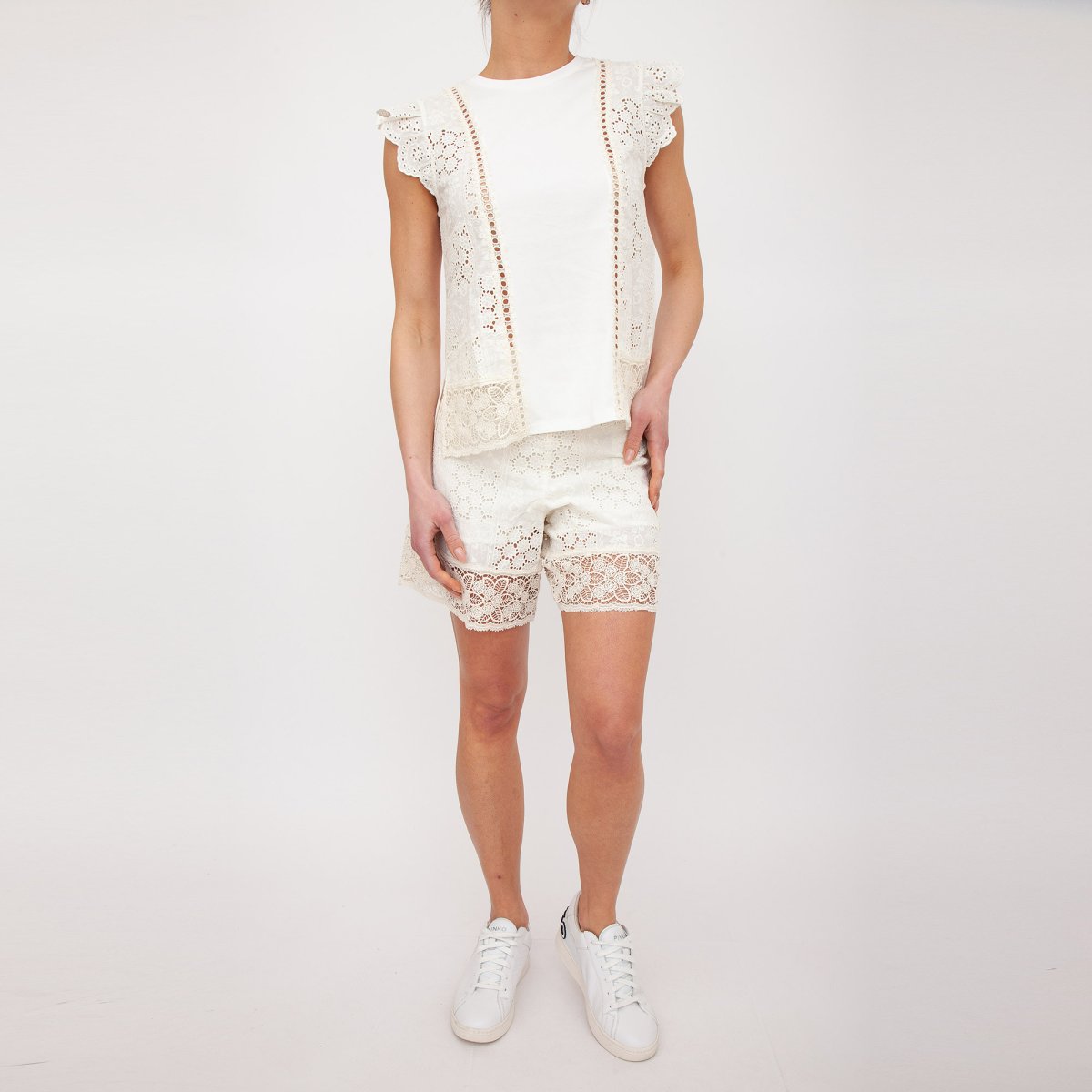 Shorts in sangallo con introdure in macramè see-through sui fianchi e al fondo, chiusura con zip, foderati.