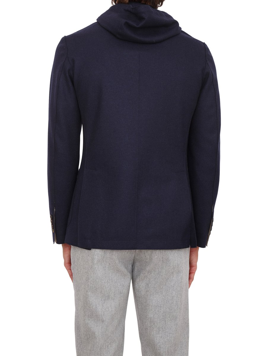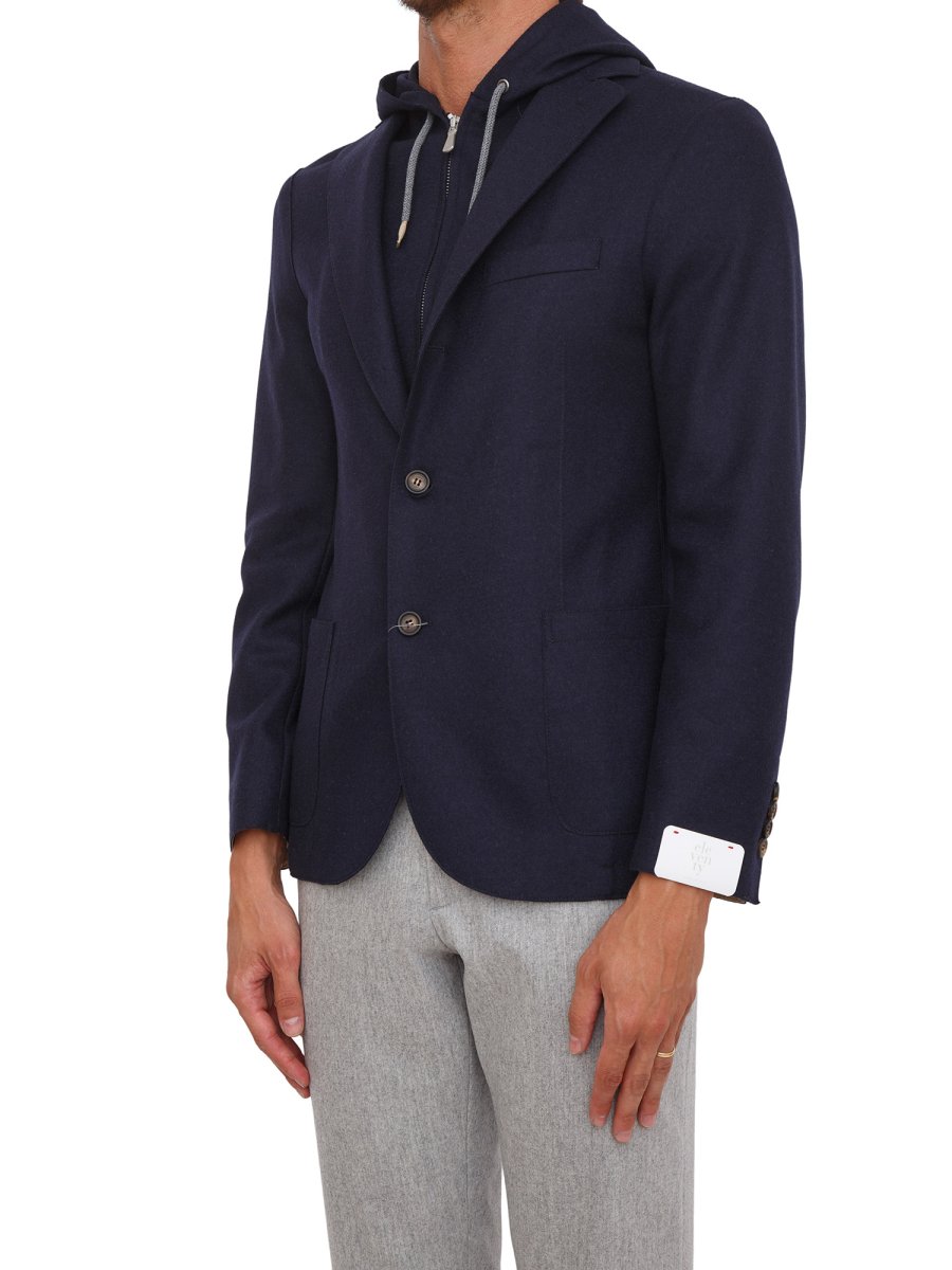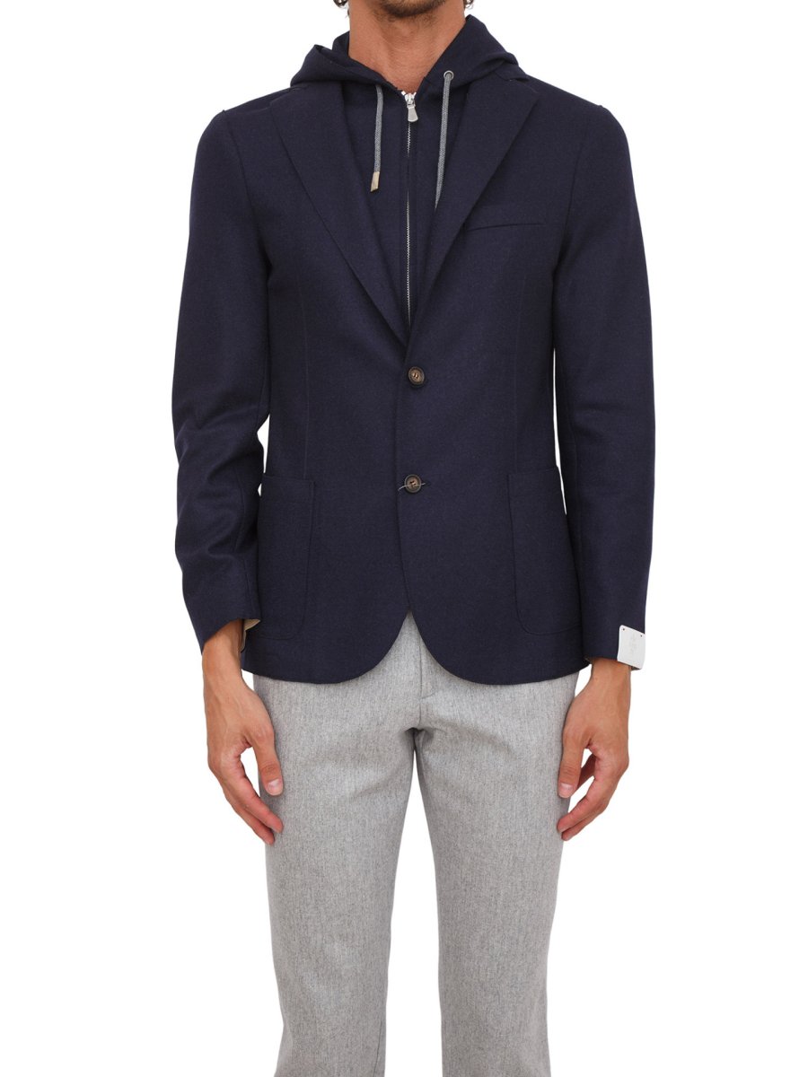 Blazer monopetto Eleventy con cappuccio removibile, effetto design a più strati, revers classici, chiusura frontale con zip corta, maniche lunghe, tasca a filetto sul petto e due tasche applicate frontali.
