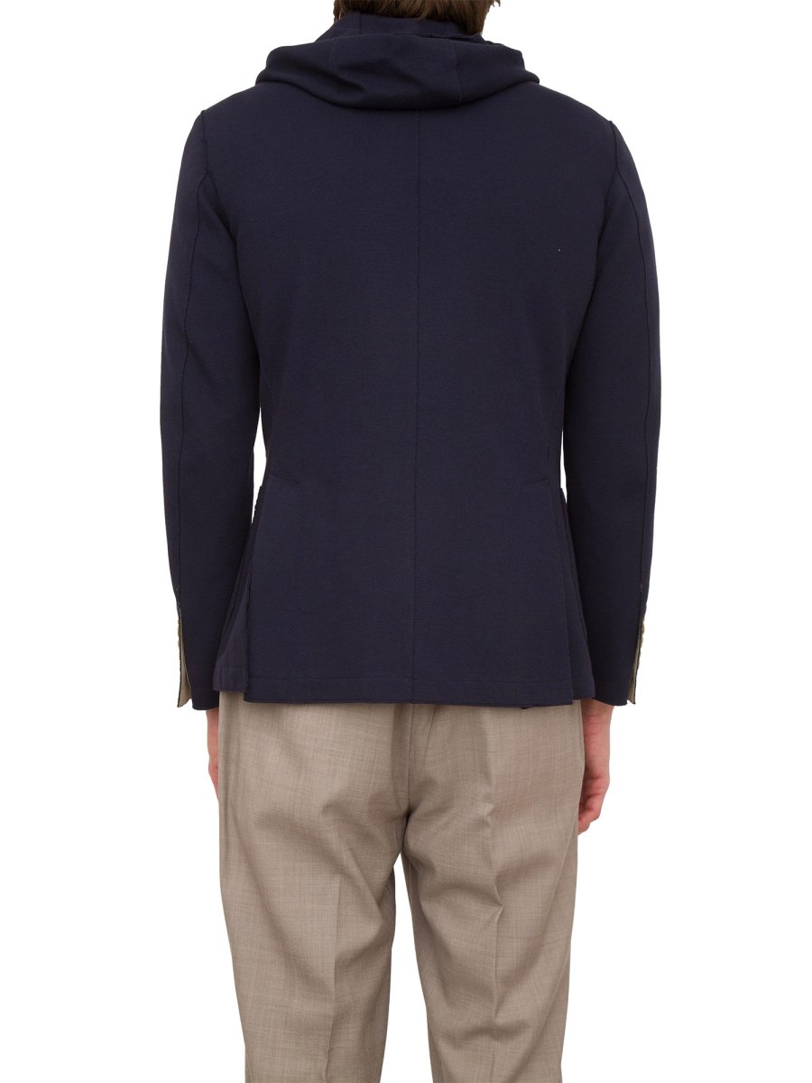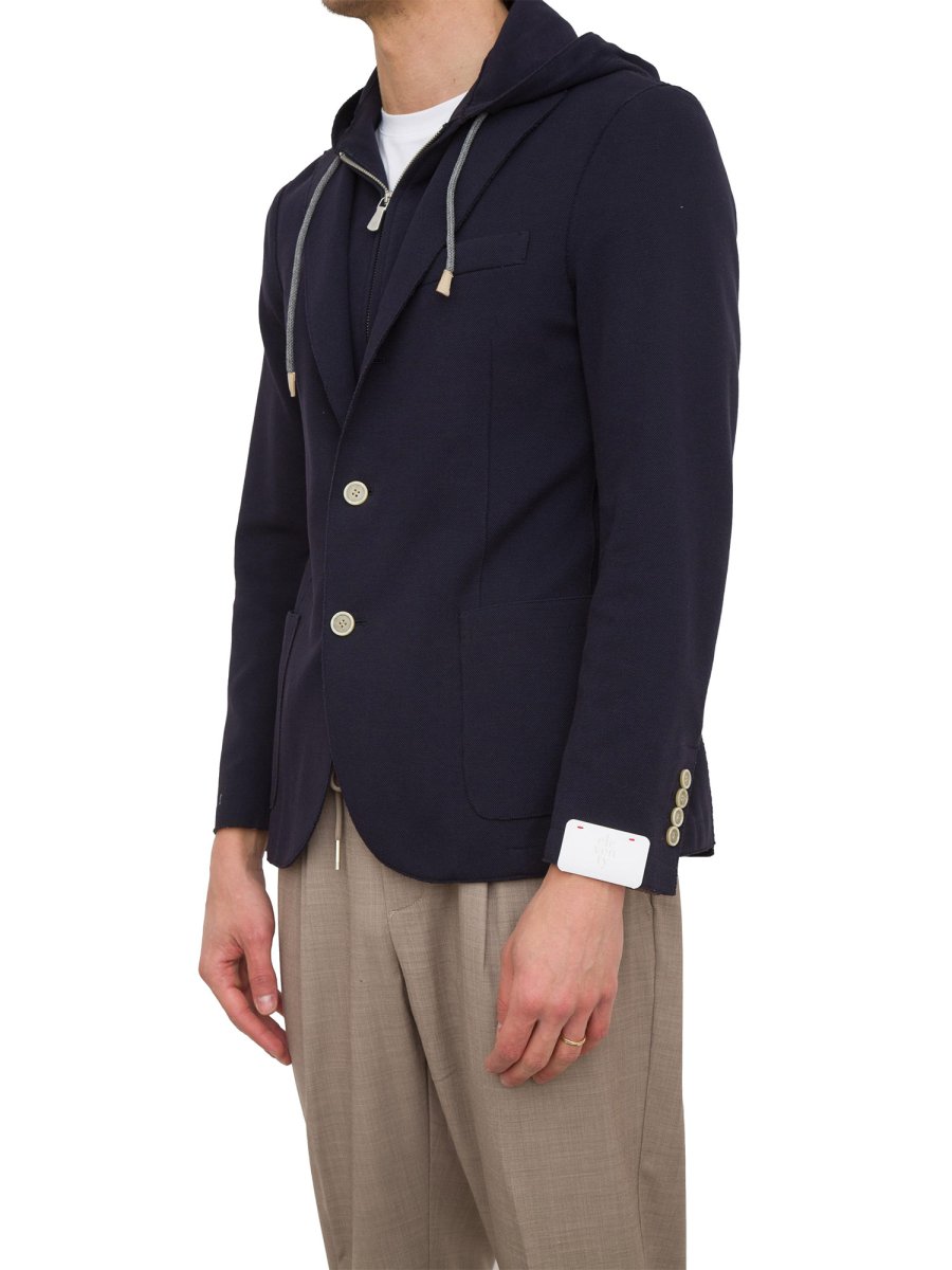 Blazer monopetto Eleventy con cappuccio realizzata in misto cotone, chiusura frontale con bottoni e zip, maniche lunghe con polsini elasticizzati, tasca a filetto sul petto e due tasche applicate frontali.