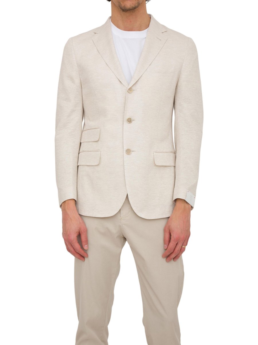 Giacca monopetto Eleventy Milano realizzata in misto lino e cotone, revers classici, chiusura frontale con bottoni, maniche lunghe, polsini con bottone, tasca a filetto sul petto, tasche frontali con patta, tasche interne a filetto e doppio spacco posteriore.