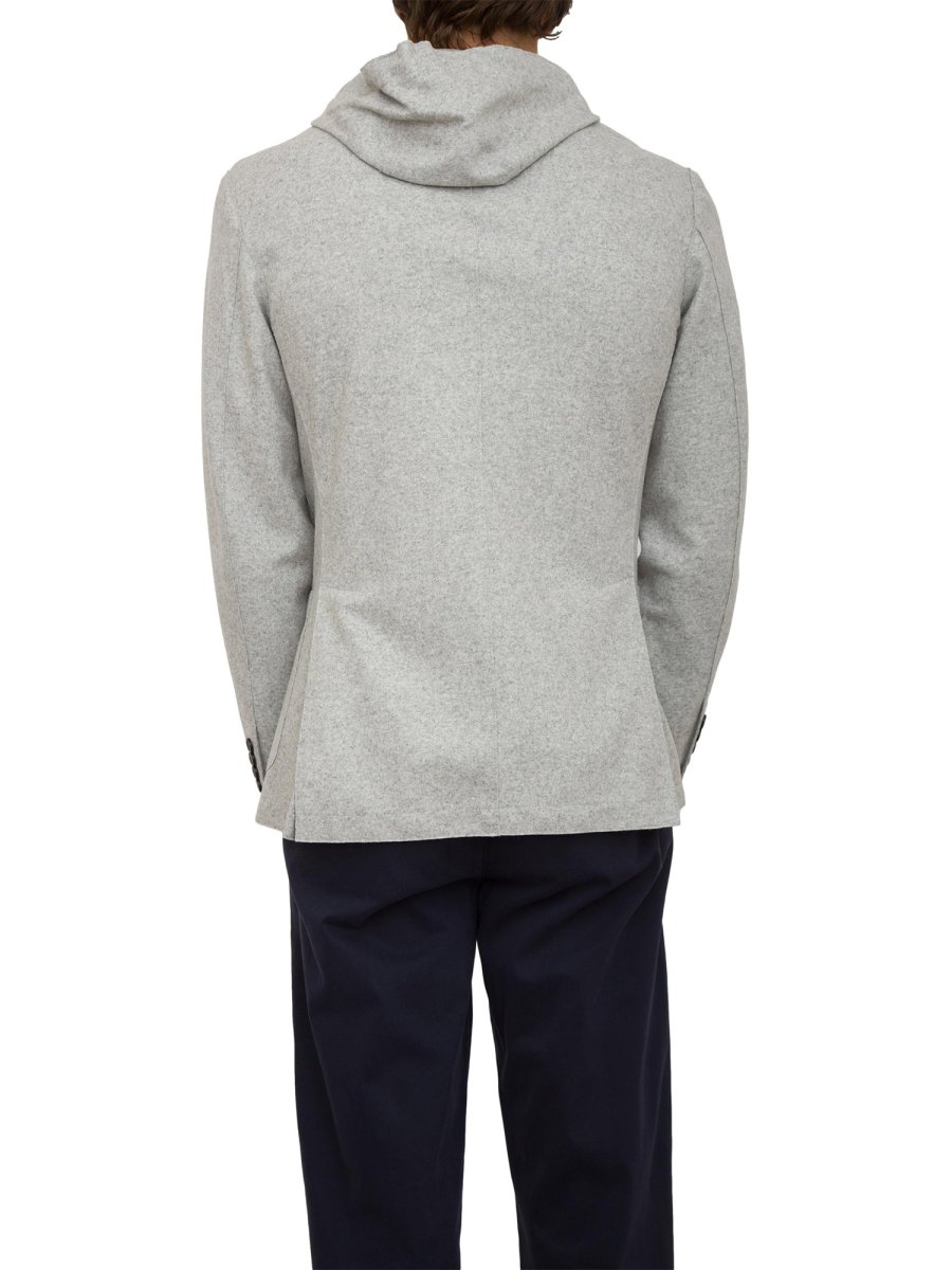 Гладкая куртка выполнена из однотонной шерсти, украшена характерными деталями из алькантары, делающими ее уникальной и особенной. Необработанный крой делает верхнюю одежду легкой, а высокий комфорт обеспечивает посадку, которая адаптируется к любой форме тела, создавая ощущение ношения свитера, сохраняя при этом безупречный внешний вид куртки. Меланжево-серая кулиска регулирует капюшон.
