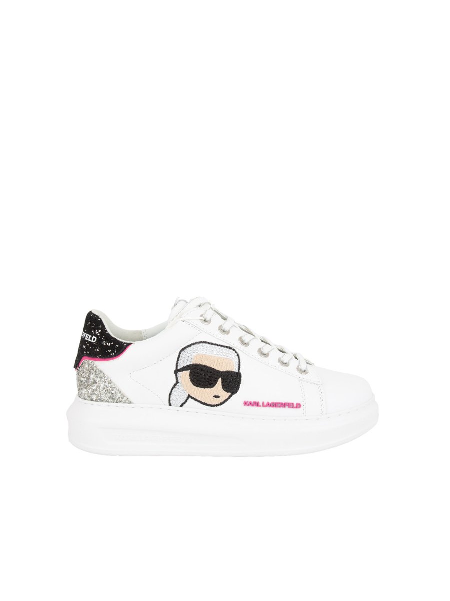 Sneakers donna Karl Lagerfeld realizzata in pelle, ricamo su tomaia con strass e glitter su retrotallone, fondo in gomma 3,5 cm e chiusura con stringhe.