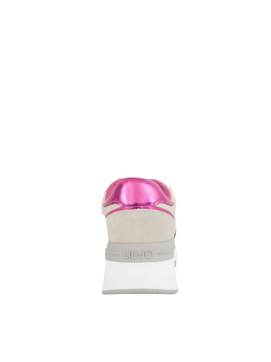 Женские кроссовки Liu Jo из бежевой замши и нейлона с ярким логотипом цвета фуксии и контрастными ламинированными вставками цвета фуксии. Дизайн со шнуровкой, контрастная подкладка и подошва на платформе дополнены задним спойлером с логотипом и зубчатым протектором. Высота подошвы: 5 см.