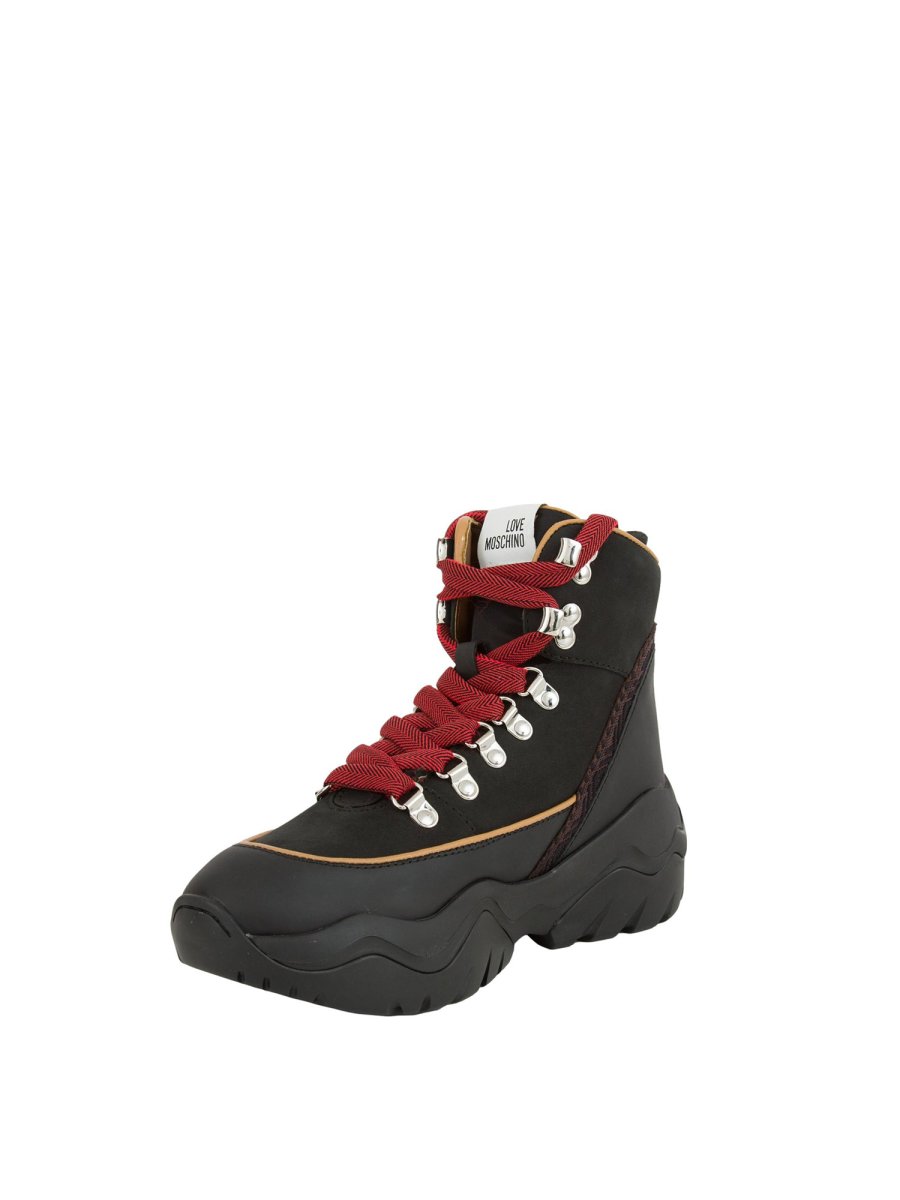 Scarpa stringata da donna Love Moschino , rcamo cuore rosso sul lato esterno della tomaia, stampa piccolo logo a contrasto, chiusura trekking con lacci e ganci in metallo e fondo in gomma realizzato con più strati dall'effetto montagna russa.