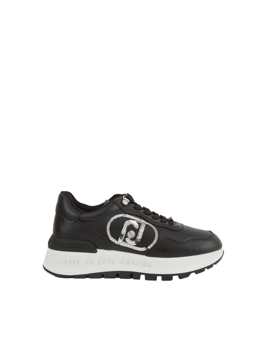 Sneakers da donna Liu-Jo con logo in paillettes, passalacci gioiello e con logo, lacci piatti tono su tono e suola platform bicolor con scritta glitterata MADE TO FEEL AMAZING. Altezza suola: 5 cm