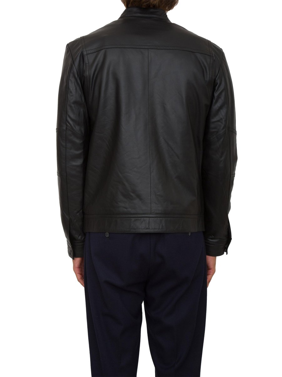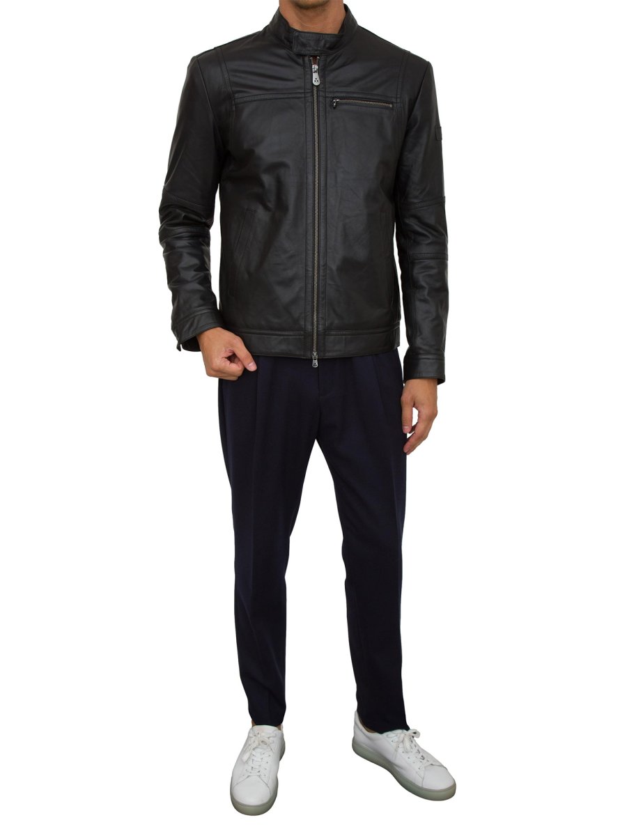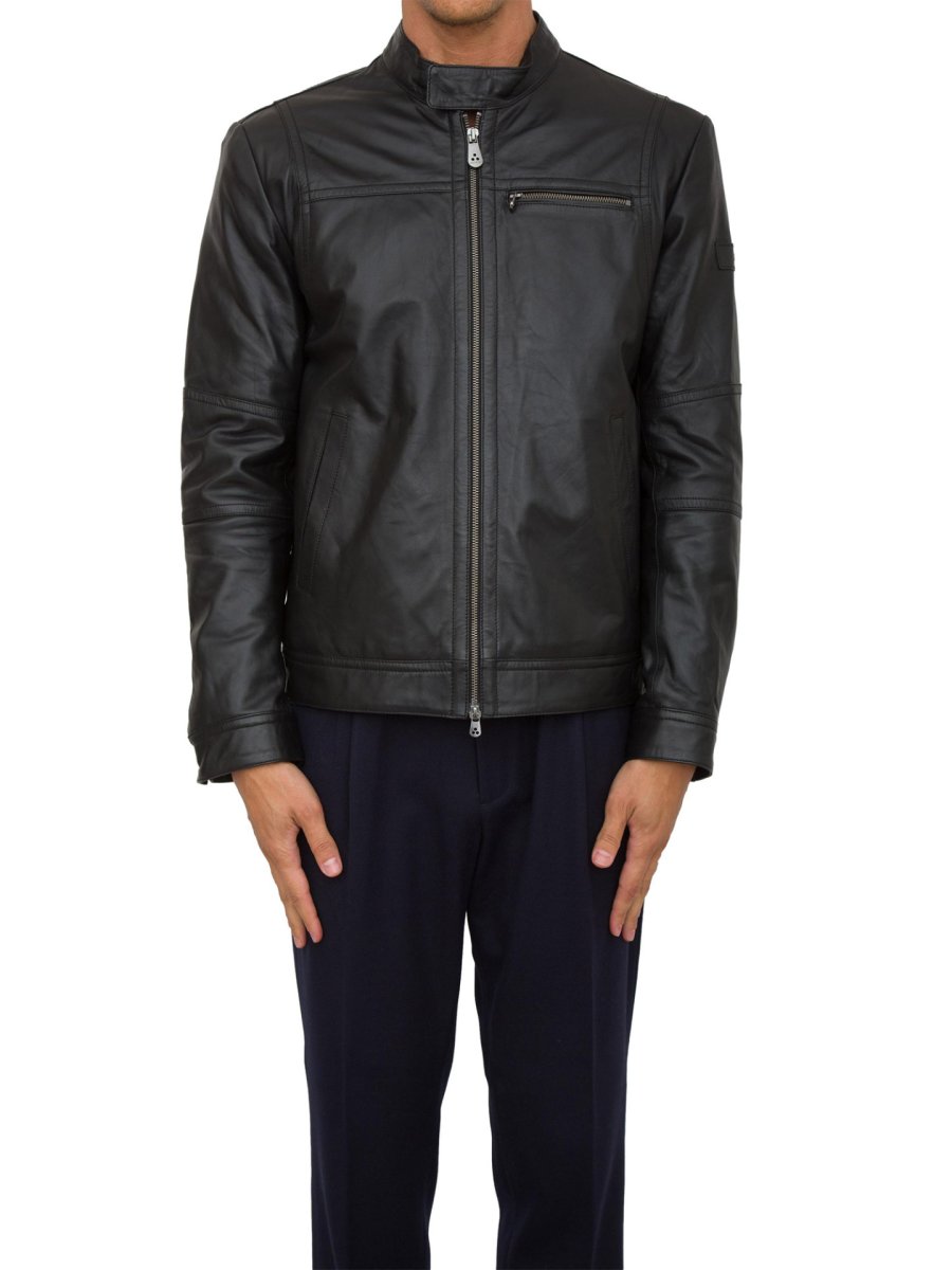 Классическая косуха из мягкой кожи с эффектом поношенности. Центральная металлическая молния с двойным бегунком, кнопки на воротнике, боковые карманы на молнии и небольшой карман слева спереди на молнии.