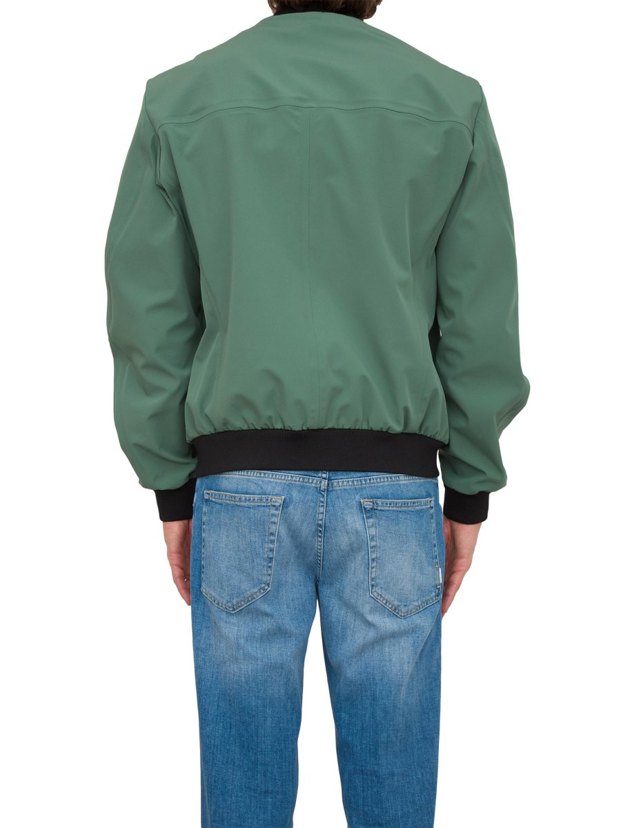 Bomber liscio in tela di nylon stretch, accoppiata ad un jersey di nylon soffice e caldo.Full zip centrale con doppio cursore e tirazip gommato, dettagli neri, tasche laterali zippate e collo in piedi. L’elastico in maglina al fondo, al collo e ai polsi, in contrasto colore, garantisce un’ottima performance termica.