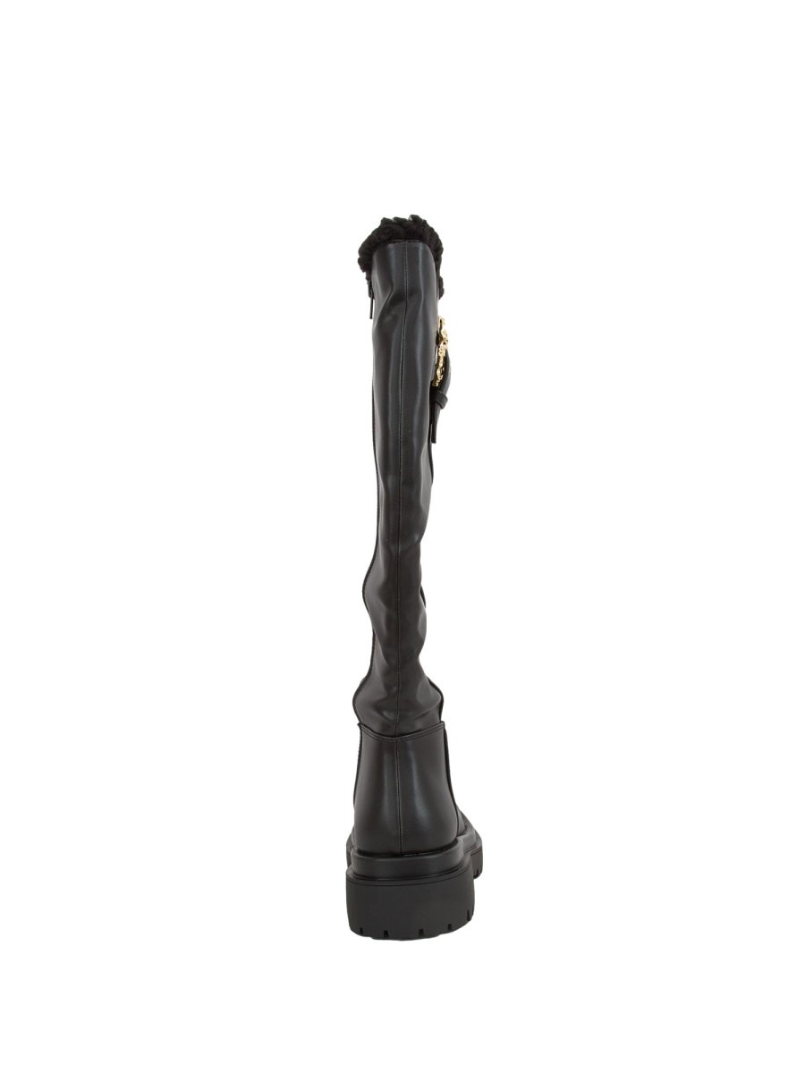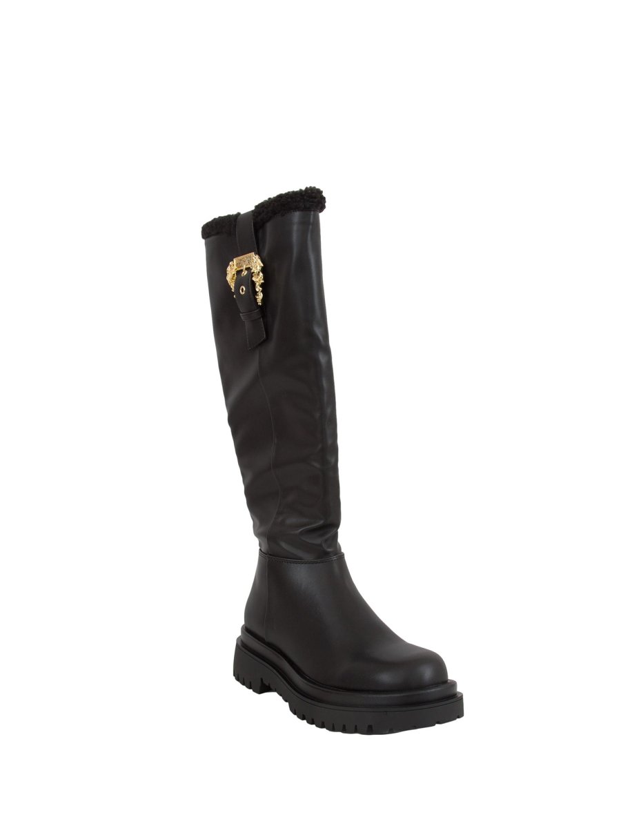 Stivali da donna Versace Jenas Couture realizati in ecopelle. Questi stivali al ginocchio sono caratterizzati dalla fibbia Baroque, suola in gomma e chiusura con zip laterale.