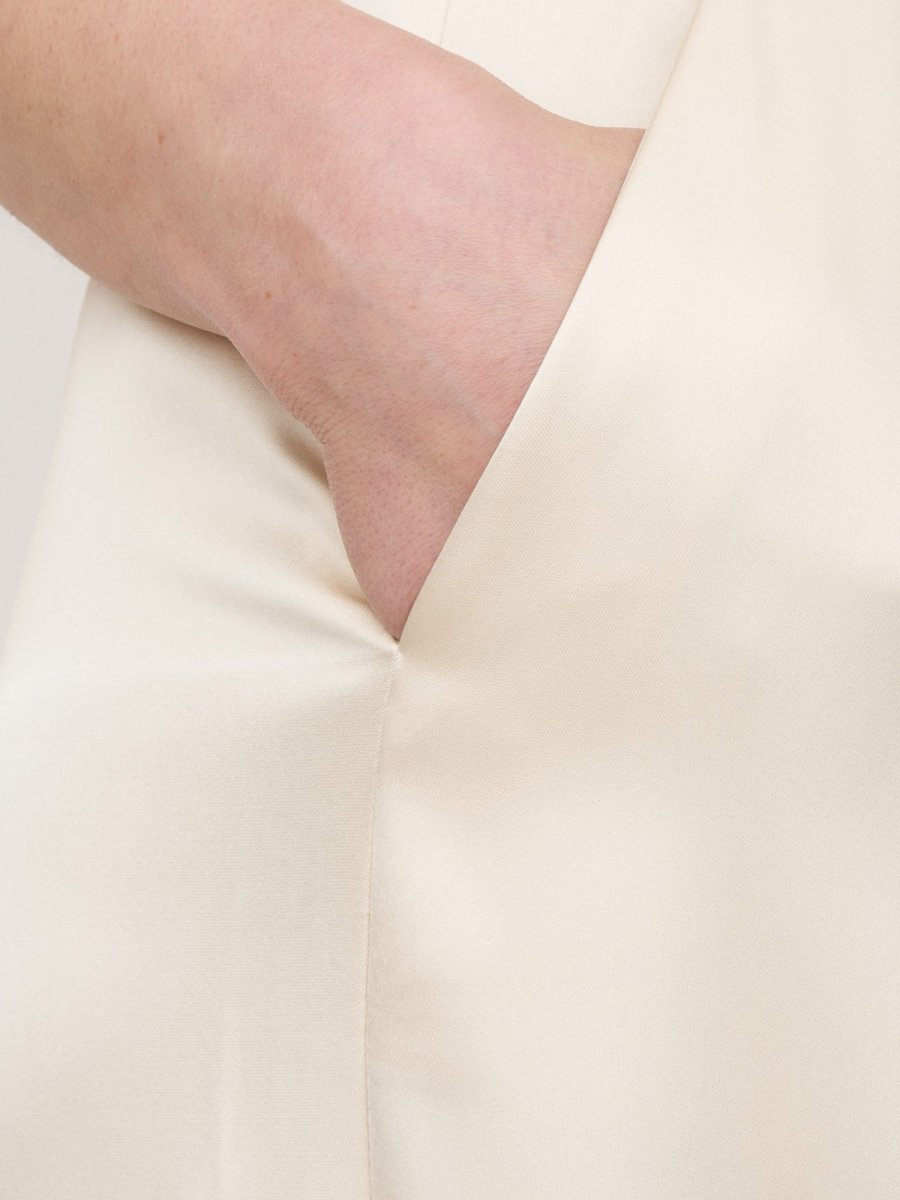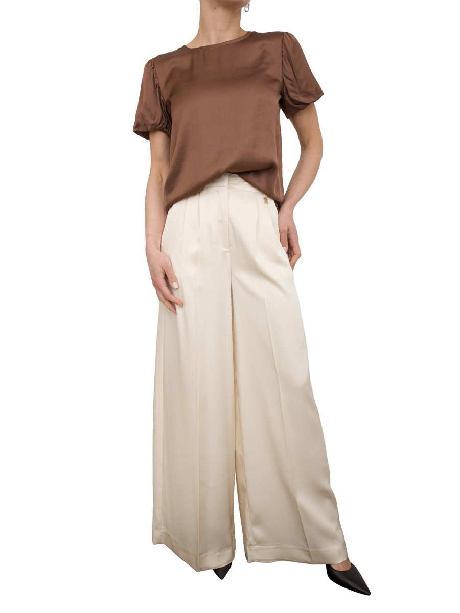 Брюки-палаццо прямого кроя из атласа, стандартная талия, французские карманы спереди и широкий низ. Идеальны для создания изысканного и элегантного образа.