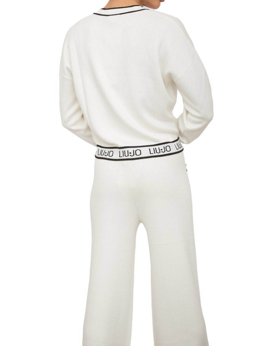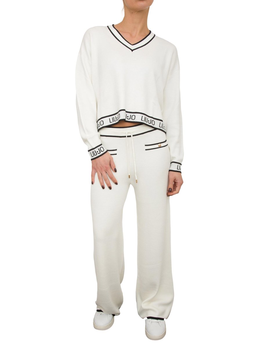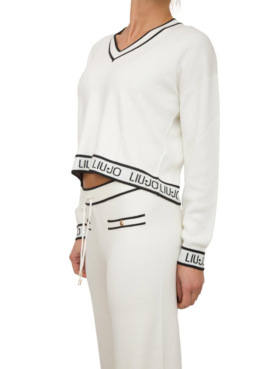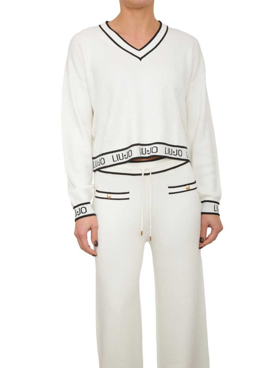 Откройте для себя женский свитер Liu Jo из смесового шелка, элегантный и универсальный. С V-образным вырезом, контрастными деталями, жаккардовым логотипом на манжетах и подоле. Идеально подходит для изысканного и повседневного образа.