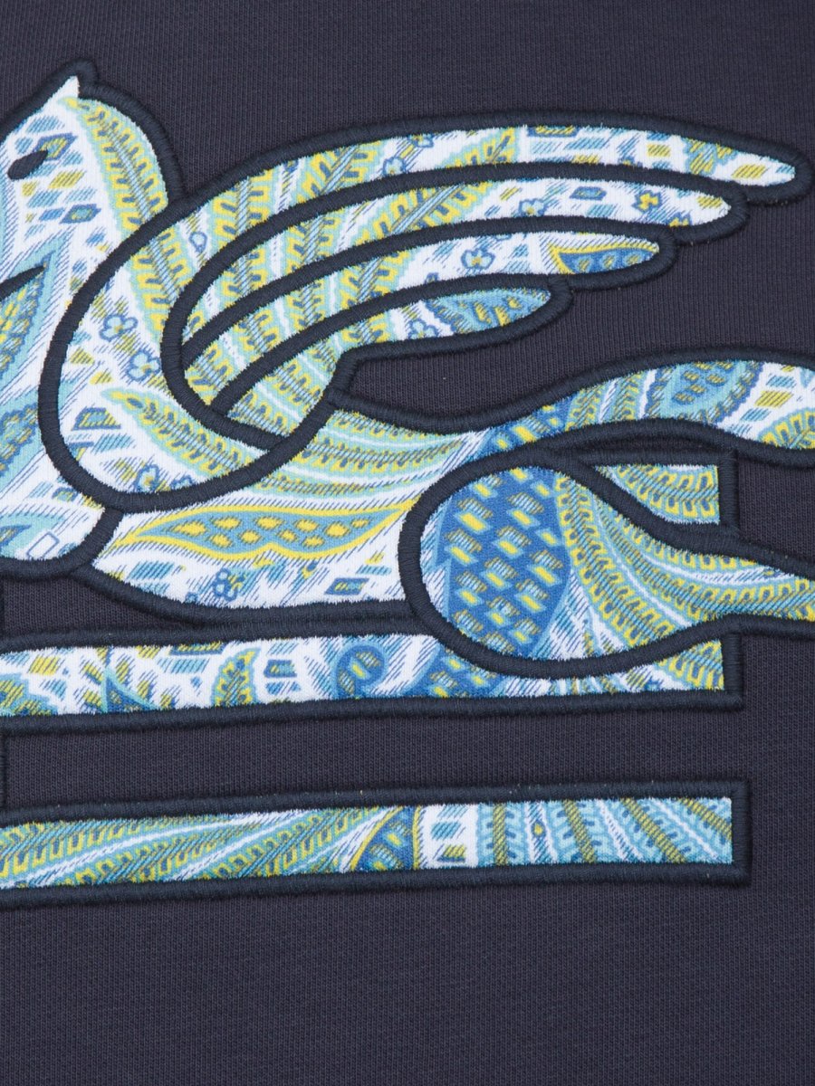 Мужская толстовка Etro из хлопка с крупной вышивкой Пегаса на контрастной узорчатой ткани спереди. Модель с длинными рукавами и капюшоном на шнурках и завязках с аппликацией из золотистого металла с логотипом Etro.