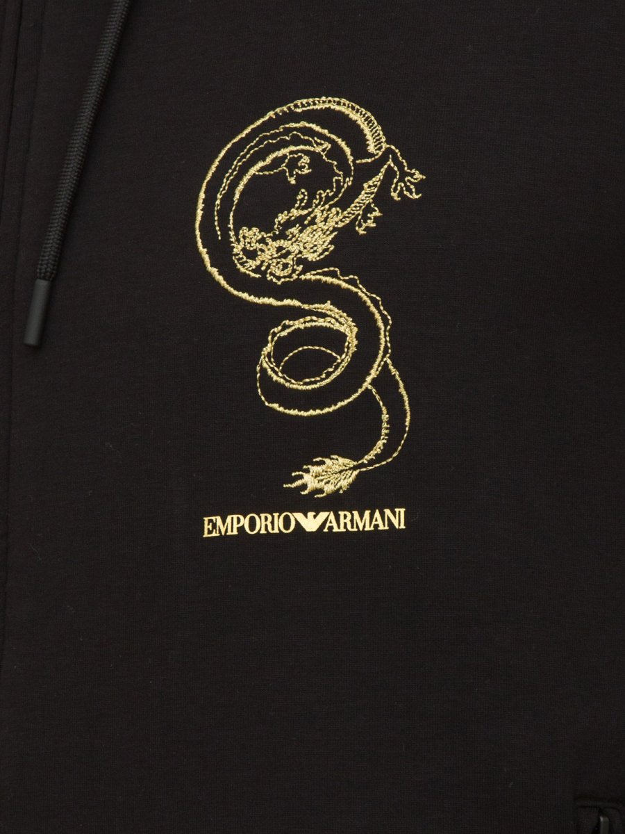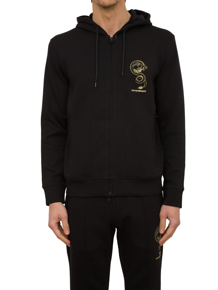 Felpa da uomo con zip frontale, cappuccio provvisto di coulisse e ricamo drago sul petto, realizzata in double jersey di cotone.