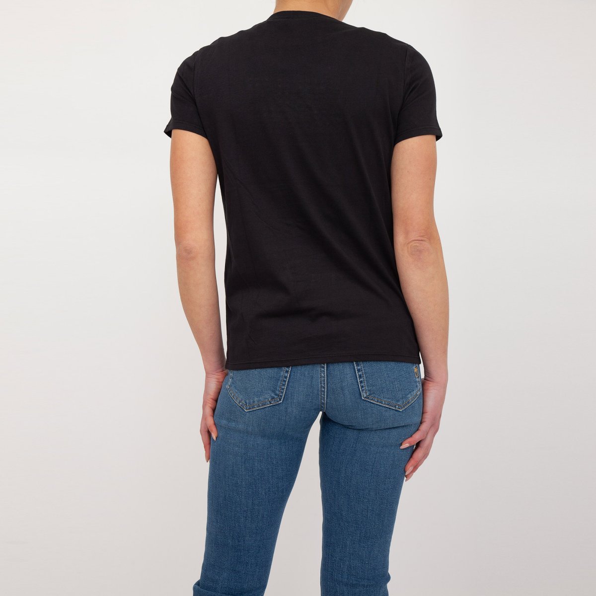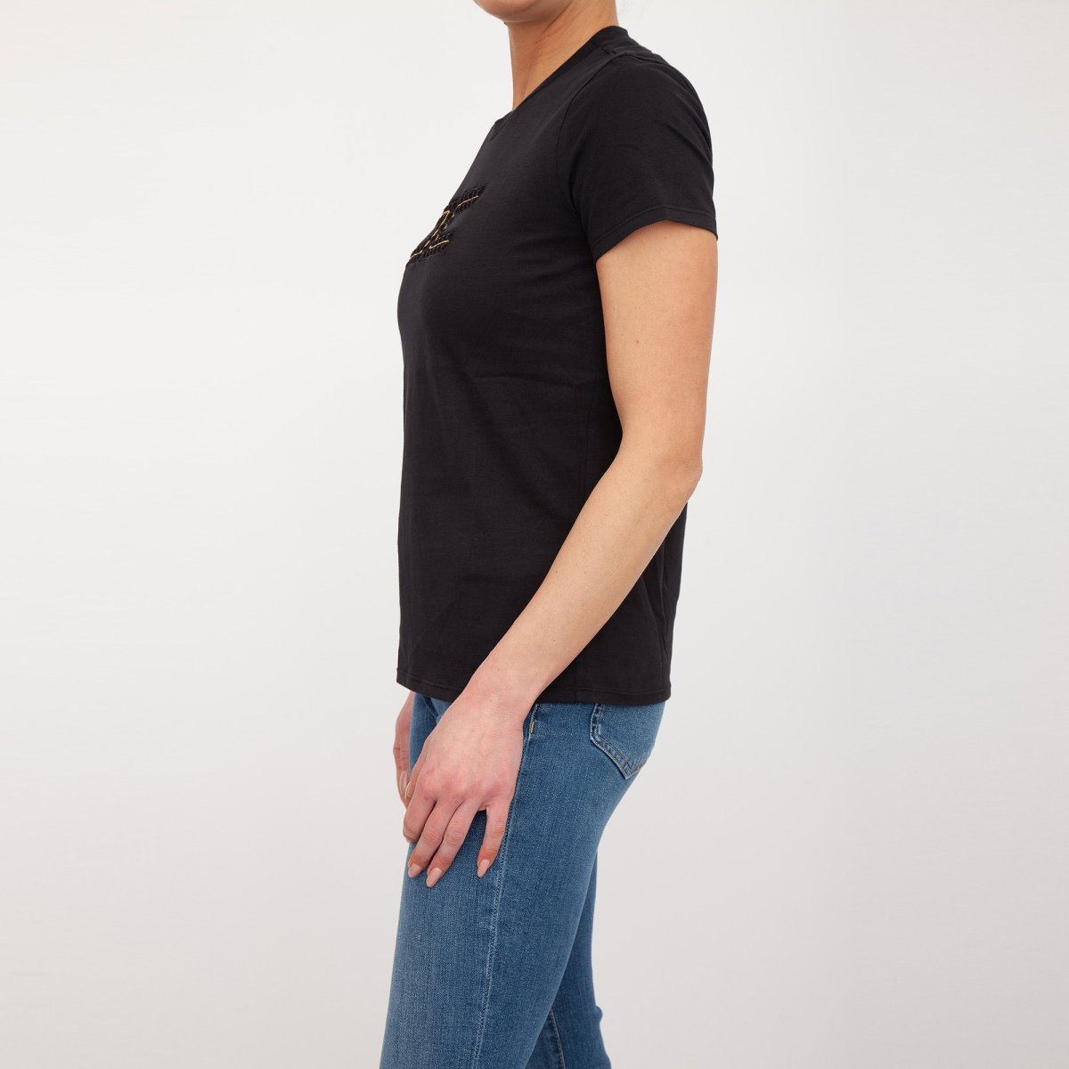 T-shirt girocollo, in jersey di cotone dalla vestibilità dritta, con logo posto centralmente sopra al seno ricamato a filo con particolare tecnica che riproduce tridimensionalmente borchieposizionate in due file regolari e distanziate da una sottile catenella in metallo dorato.
