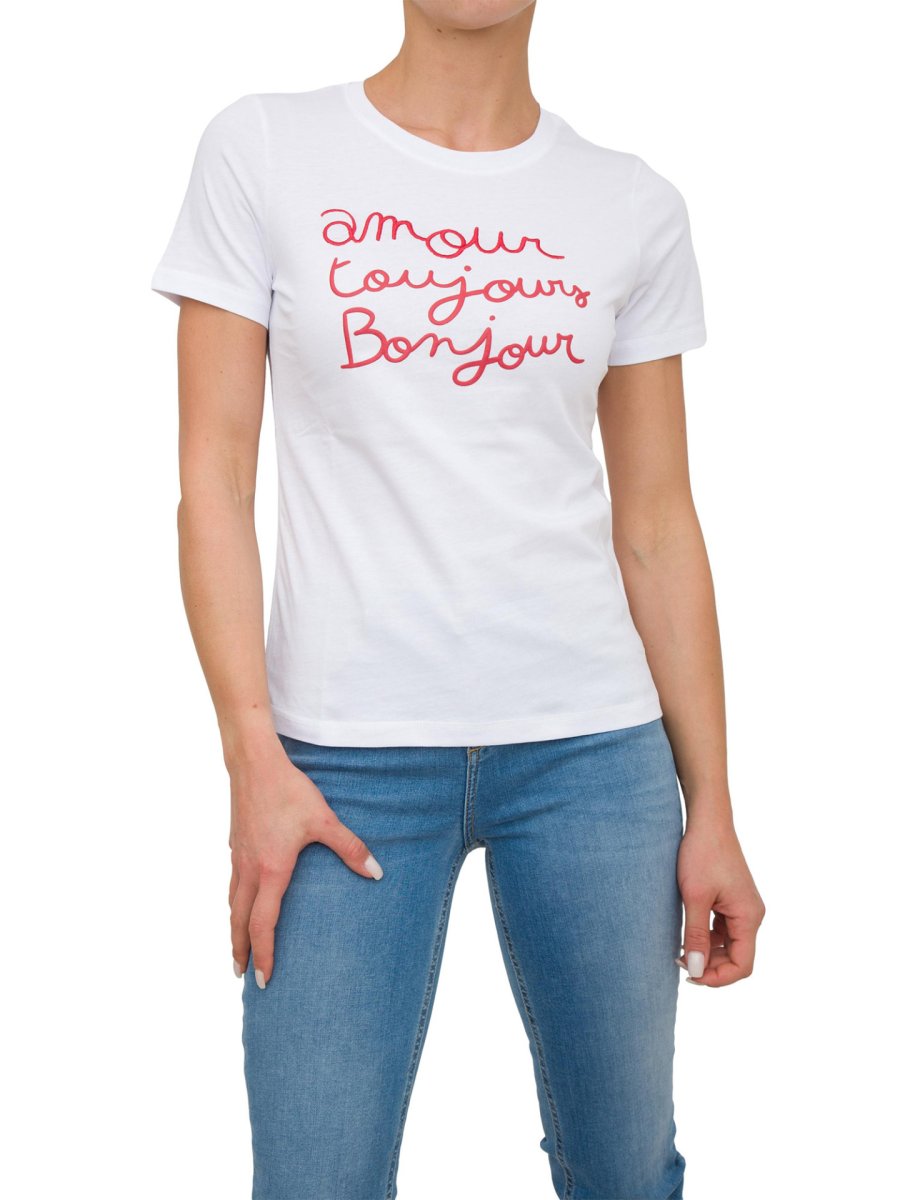 T-shirt bianca in jersey di puro cotone è un essential di ogni guardaroba. Fit regolare e dettaglio a contrasto sul davanti per un classico del basic wear. Il capo fa parte della capsule Marella JE T’AIME: realizzata in collaborazione con Agathe Sorlet per celebrare San Valentino.