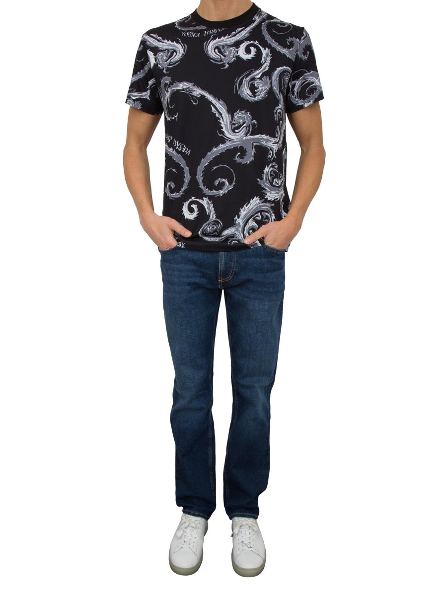 Мужская футболка Versace Jeans Изготовлена из высококачественного хлопка, имеет классический крой, гарантирующий комфорт и свободу движений. Символизируюет самобытный и изысканный стиль, характеризуется классическим принтом в стиле барокко и сплошным логотипом, сочетает в себе традиции и современность. Идеально подходит для тех, кто предпочитает повседневный роскошный образ. Это универсальная вещь, которую можно носить в любой ситуации, с типичным стилем Versace.
