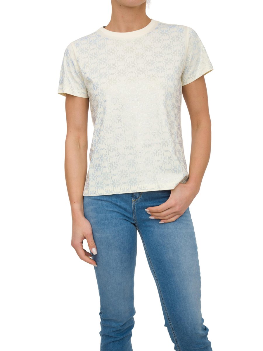 T-shirt a maniche corte in jersey di cotone con pattern logo Love Birds all-over realizzato con strass luminosi e colorati.