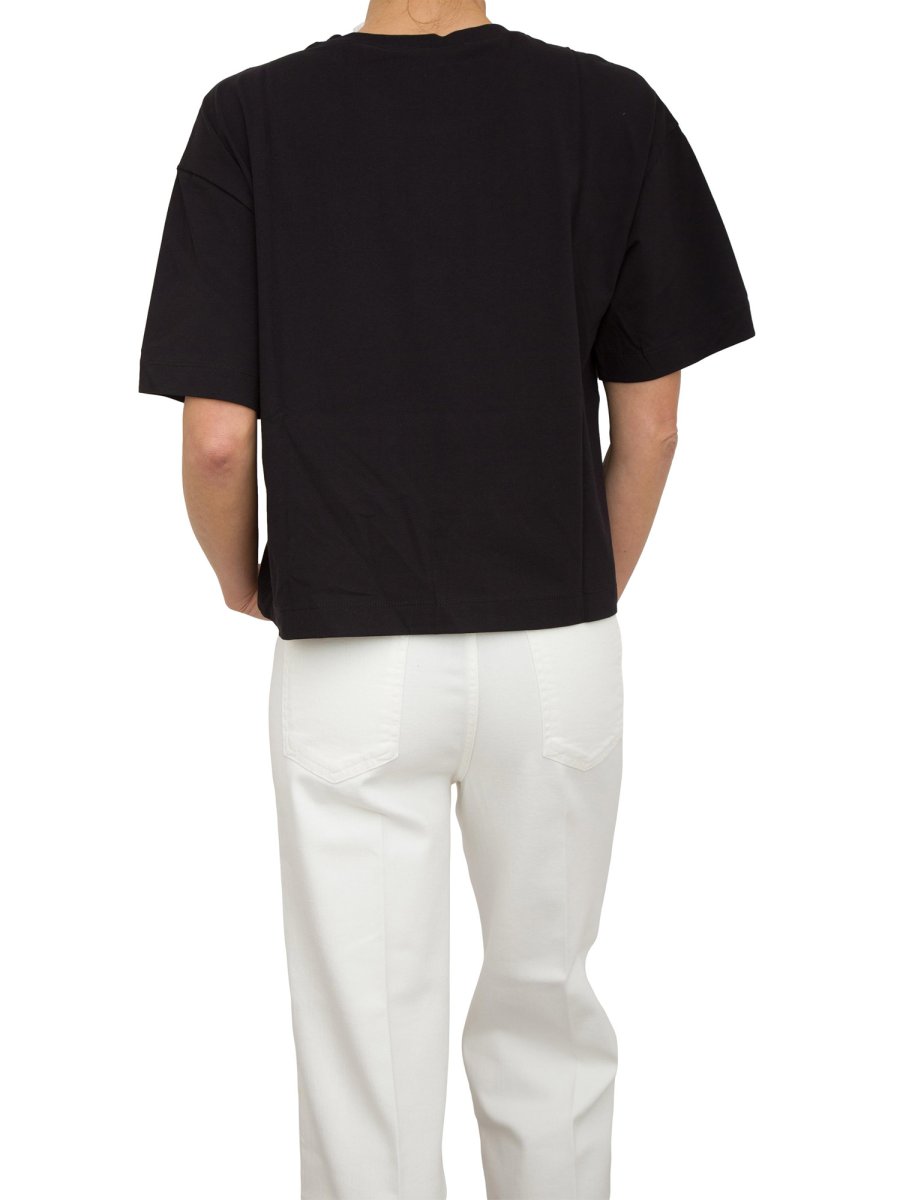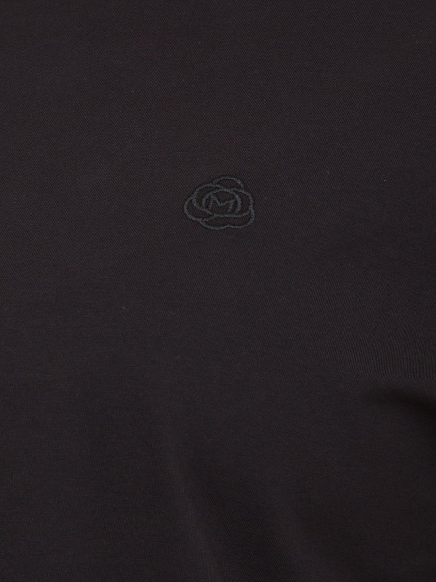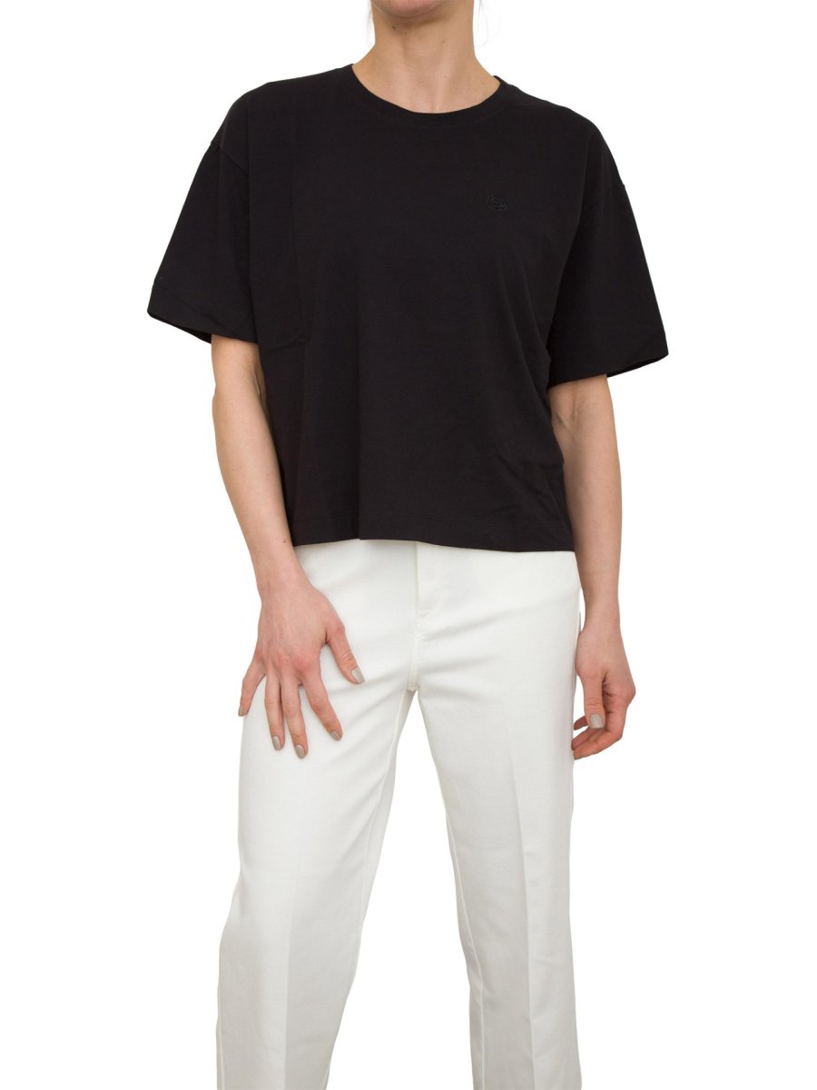 Футболка из эластичного хлопкового трикотажа, свободного кроя, с круглым вырезом в рубчик, рукавами три четверти и вышивкой на груди.