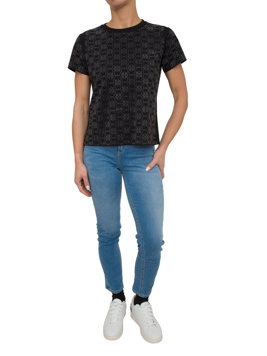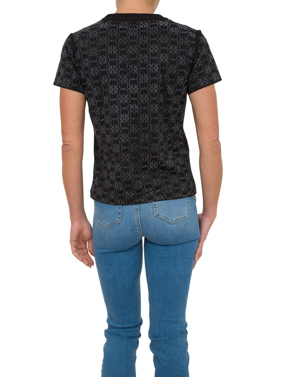 T-shirt a maniche corte in jersey di cotone con pattern logo Love Birds all-over realizzato con strass luminosi e colorati.