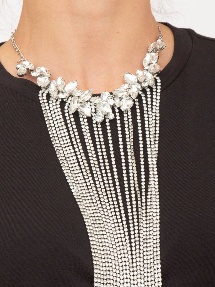 Ключевой предмет гардероба. Футболка Blugirl из эластичного хлопка со съемным хрустальным ожерельем с бахромой из цепочек, круглый вырез, короткие рукава со спущенными плечами, стандартный крой. Интерпретируется по вашему желанию в зависимости от случая.