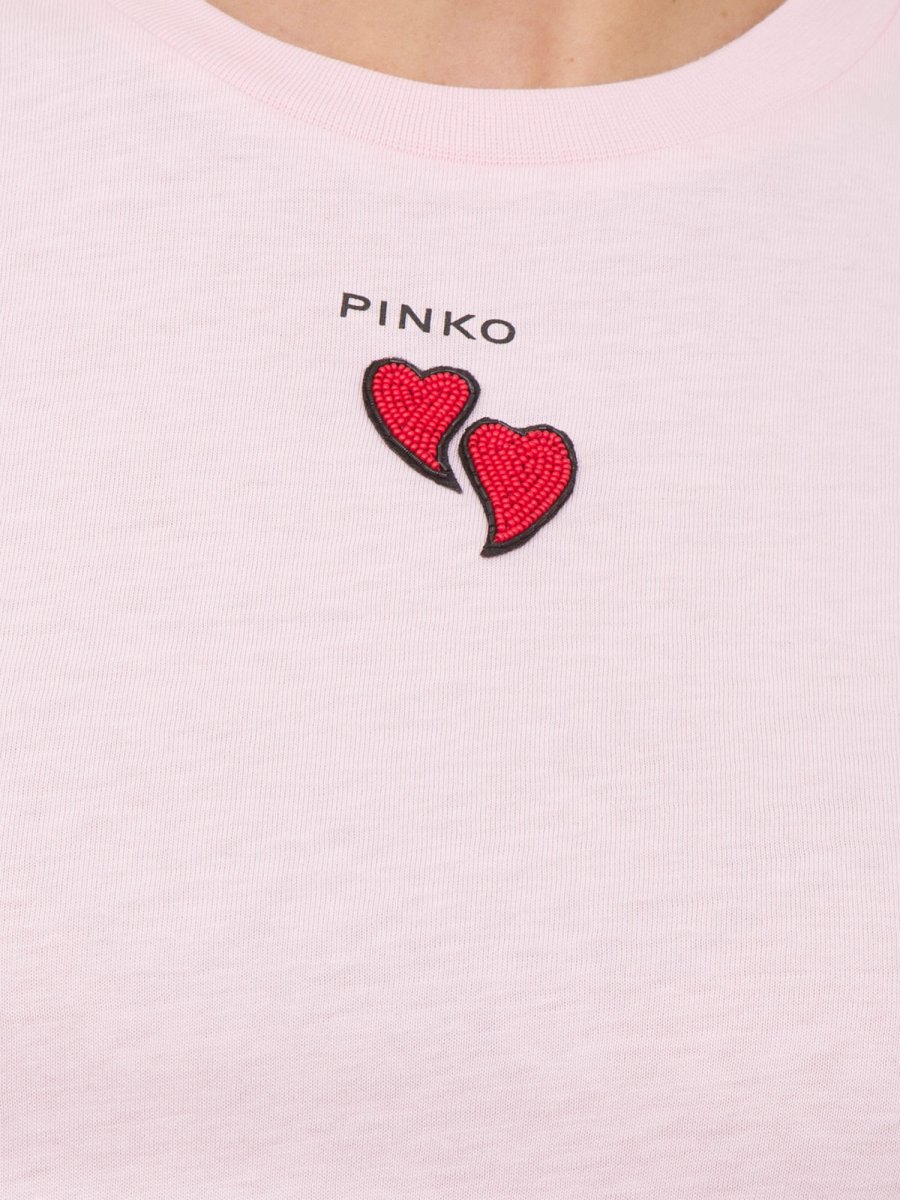 T-shirt a maniche corte in jersey di cotone con ricamo piccoli cuori e stampa logo PINKO davanti.