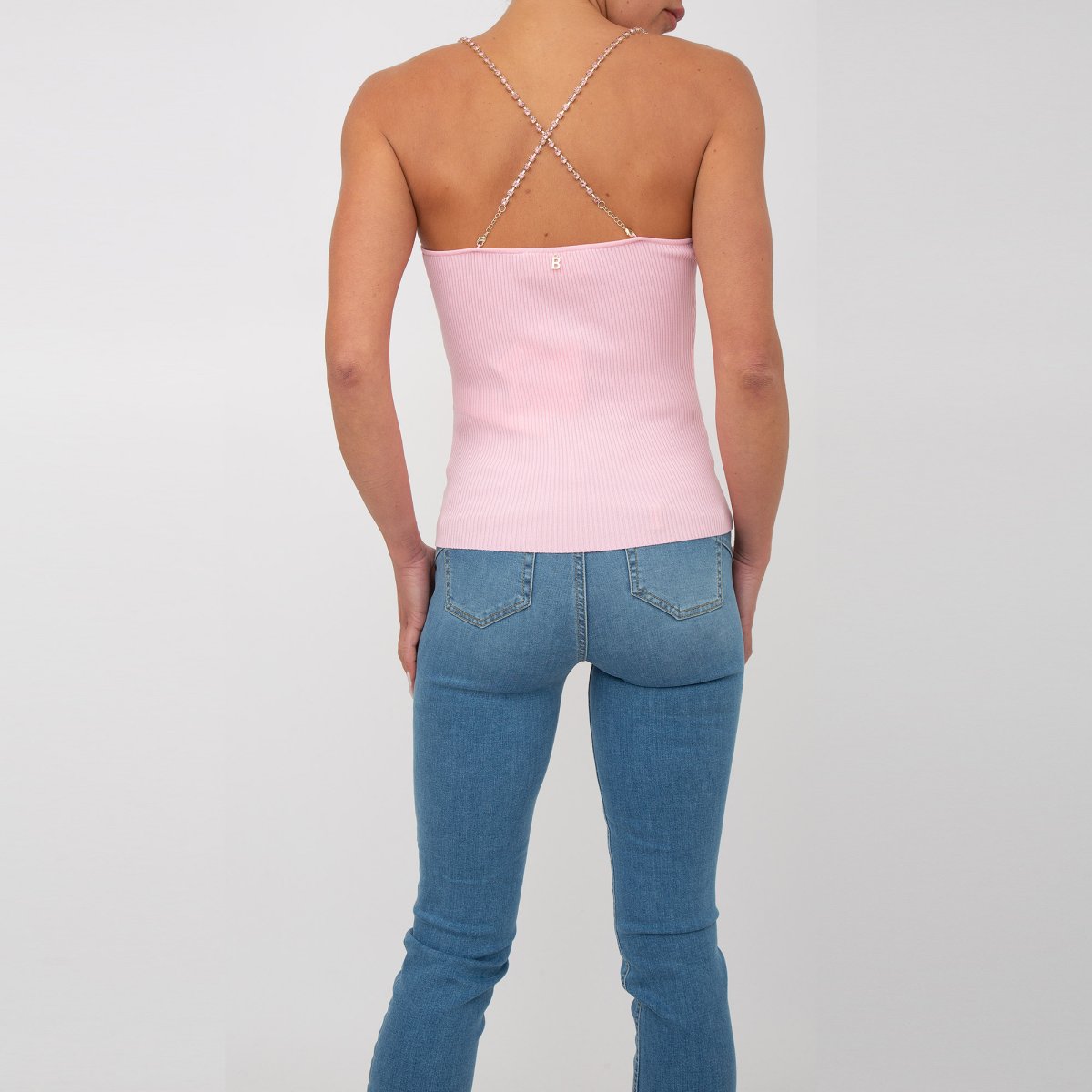 Top in viscosa stretch lavorata a costine con calature effetto bustier. E' caratterizzato da spalline in catena di strass in tono che puoi rimuovere per il lavaggio.
