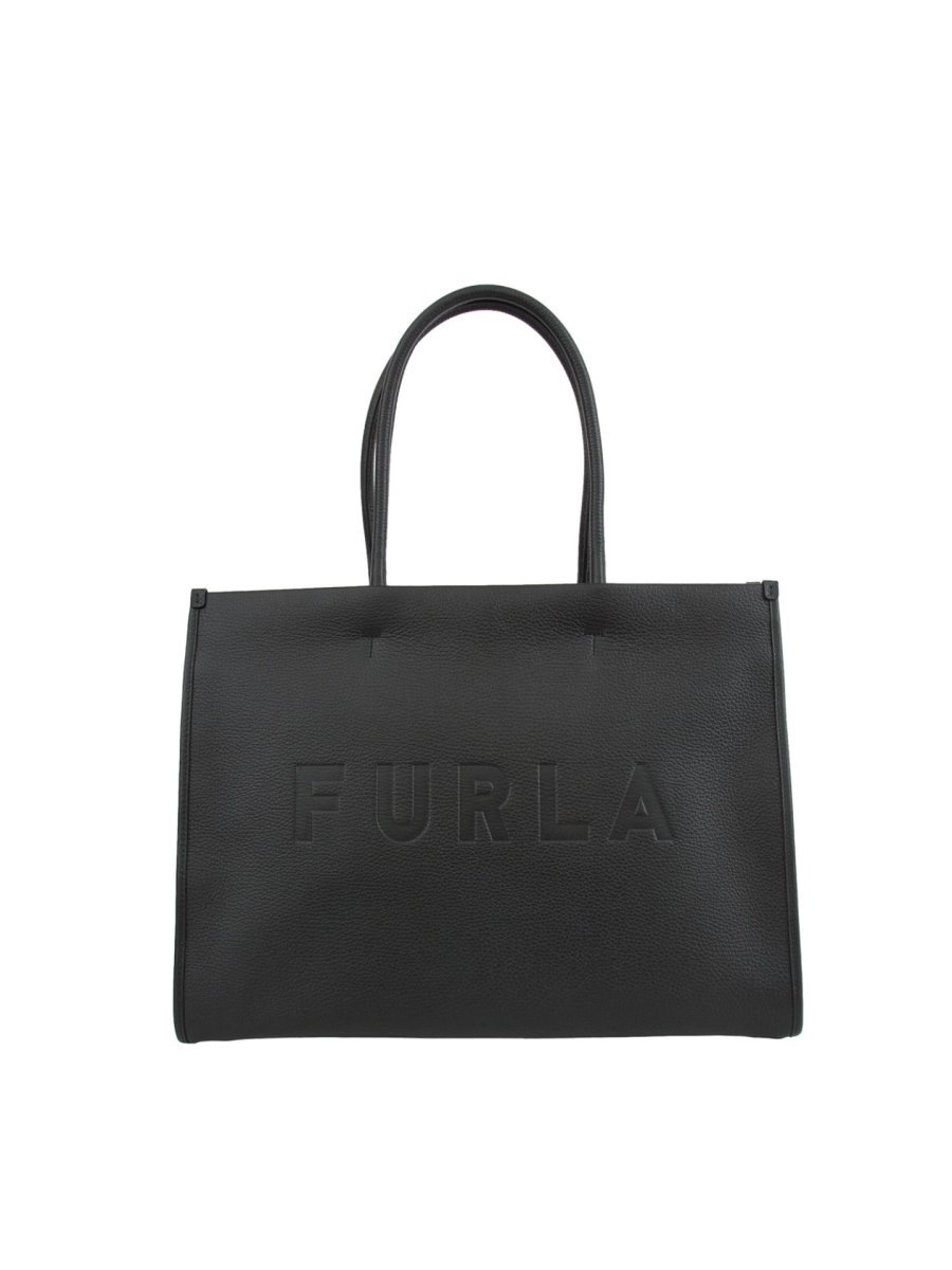 Tote bag Furla Opportunity. Realizzata in pelle martellata si distingue per il maxi logo lettering impresso tono su tono sul davanti. I pannelli laterali in pregiata pelle nappa creano una struttura rettangolare dall'animo elegante e morbido. 41.5 x 32.0 x 17.0