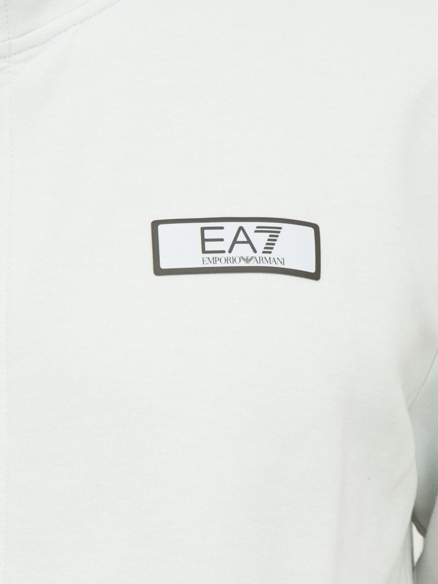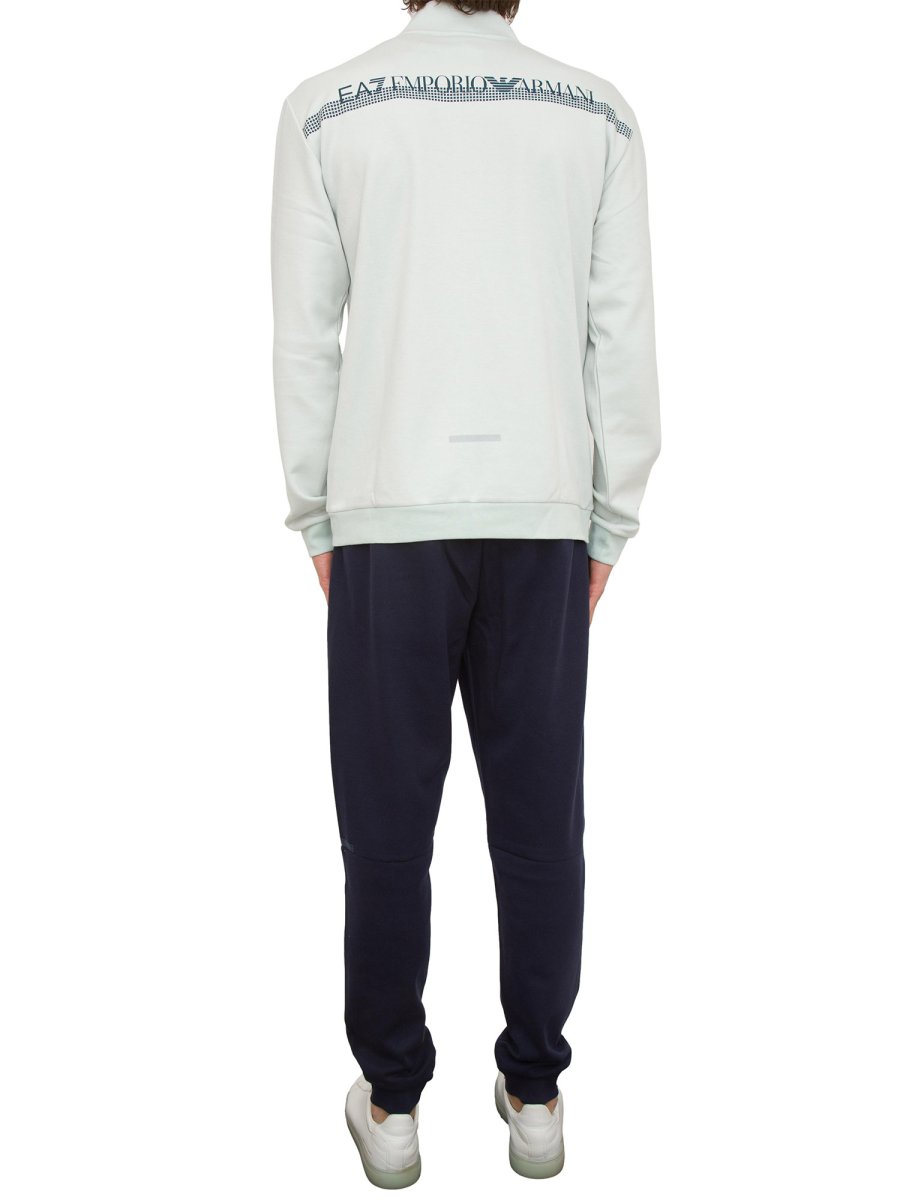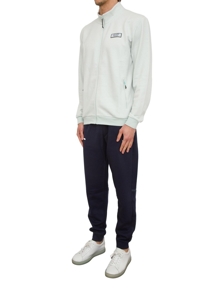 Tuta composta da felpa con collo montante, chiusura con zip, due tasche laterali chiuse con zip, logo EA7 sul petto.