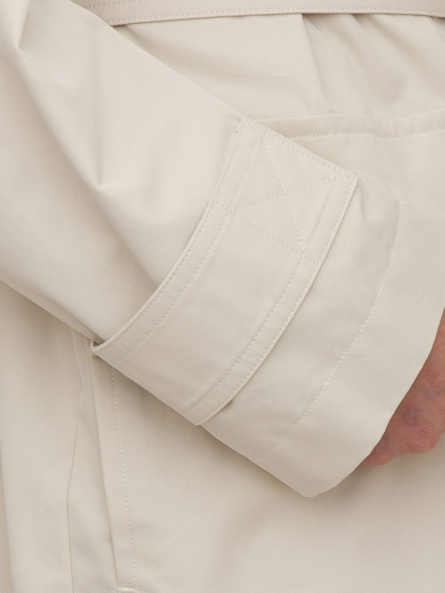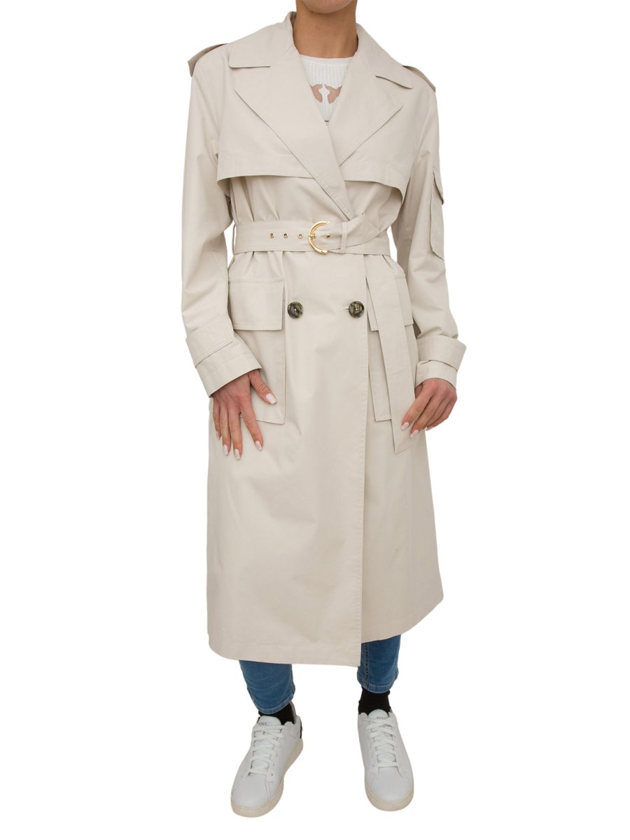 Trench dal taglio classico in gabardina tecnica di misto cotone. Collo a rever, alamari sulle spalle e a fondo manica, tasche con patta applicate su una delle due maniche e sui fianchi. Cintura abbinata nello stesso tessuto con fibbia in metallo. Mantellina e spacco centrale al fondo sul retro. Foderato. Chiusura doppiopetto con bottoni in metallo.