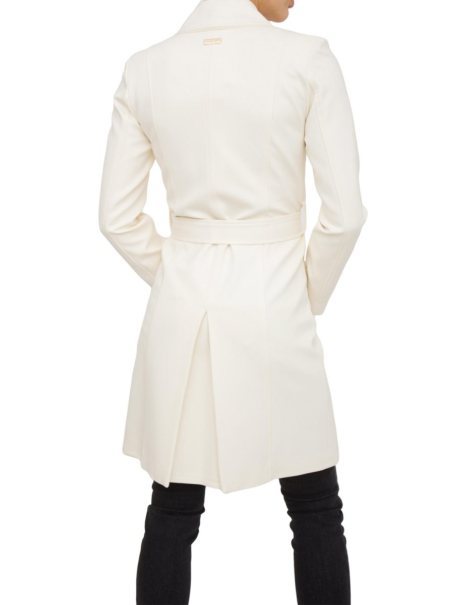 Trench doppiopetto da donna Twinset in punto Milano con passamaneria di perline, collo con revers, tasche a filetto, chiusura con bottoni, spacco sul retro.