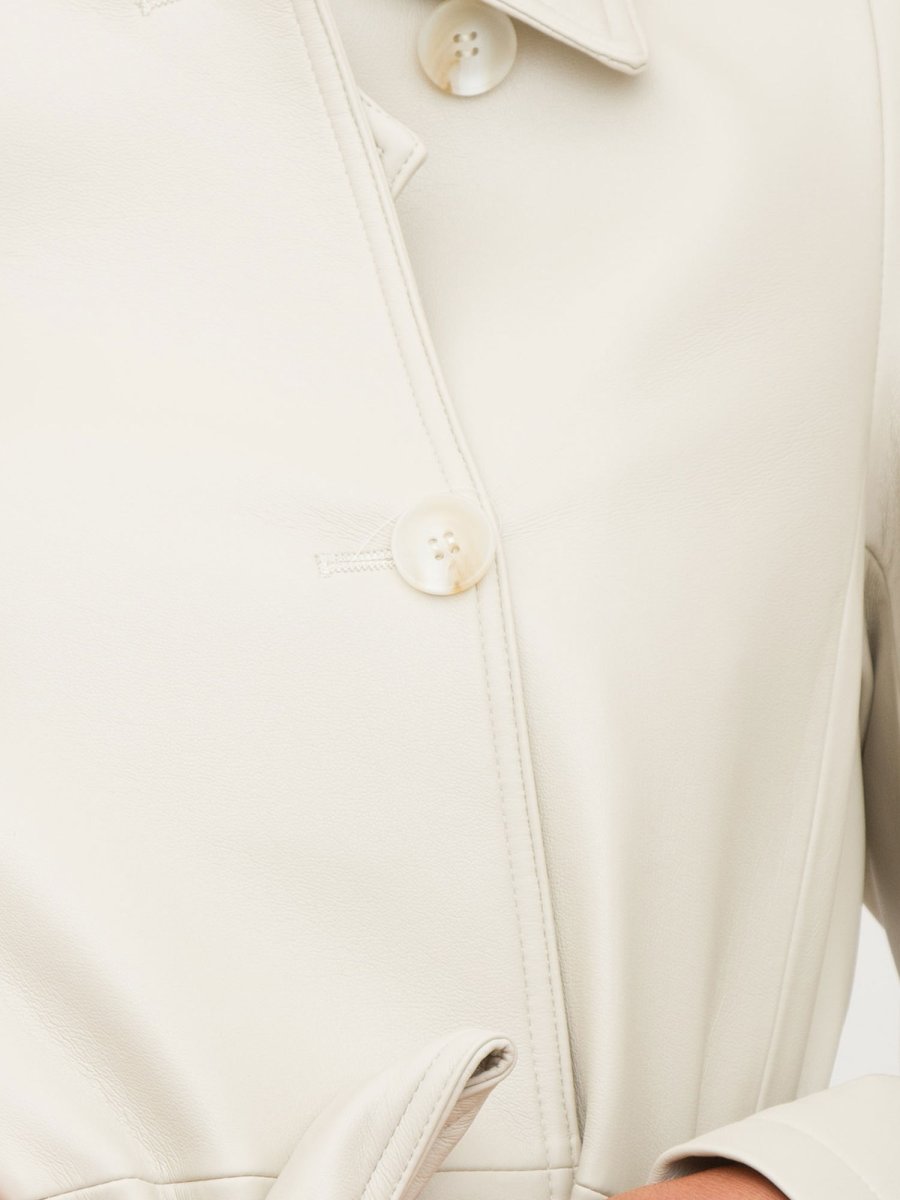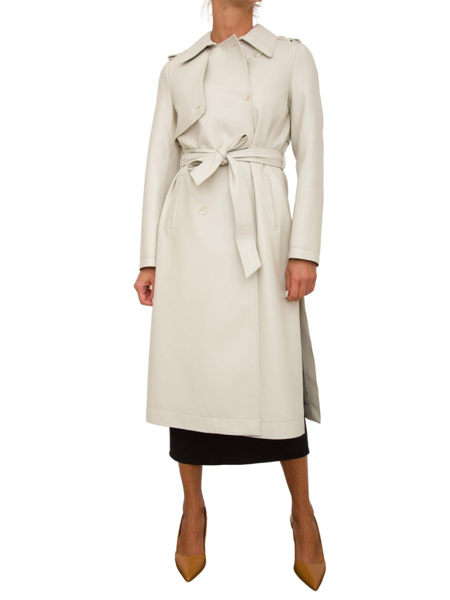 Длинный двубортный тренч с эффектом мелованной кожи, из мягкой наппы, с подходящими пуговицами и съемным ремнем в тон. Имеет воротник, лягушки на плечах, длинные рукава, передний нагрудник, боковые карманы, боковые шлицы, овальную Т-образную пластинку с логотипом на спине, мягкую посадку на подкладке.
