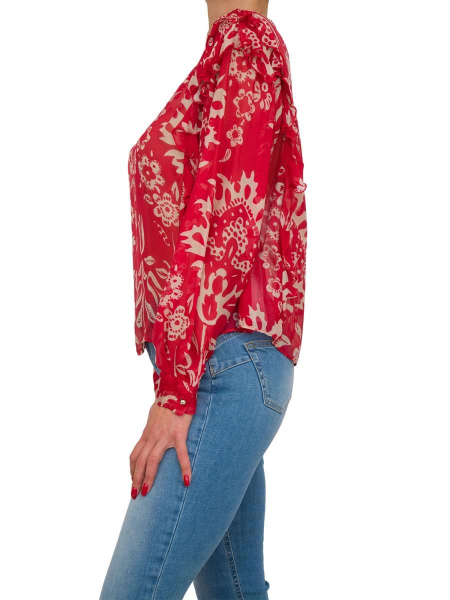 Blusa da cerimonia Liu-jo in misto seta, stampa all over, rouches sulle maniche, scollo rotondo con bottone sul davanti, maniche lunghe leggermente a palloncino, polsi con bottone e mini logo in metallo sul retro.