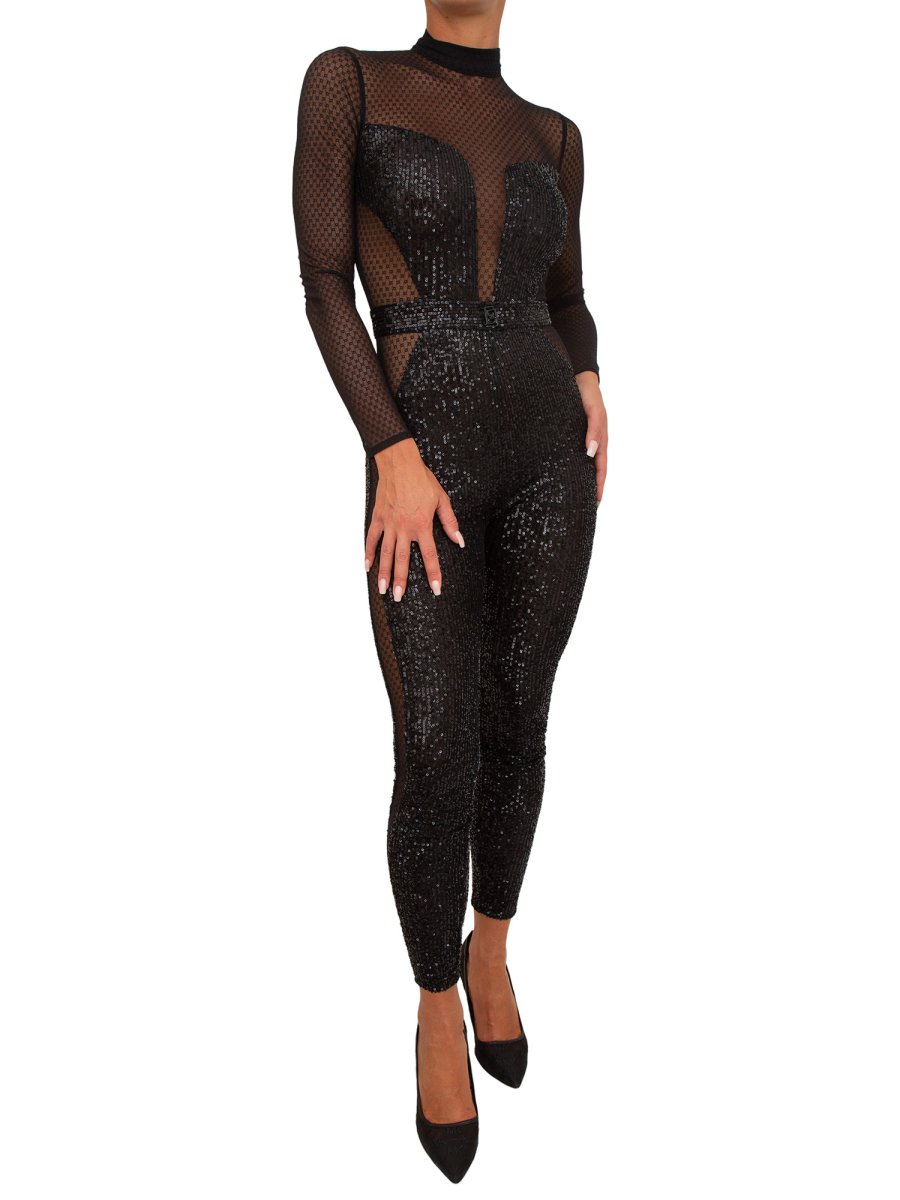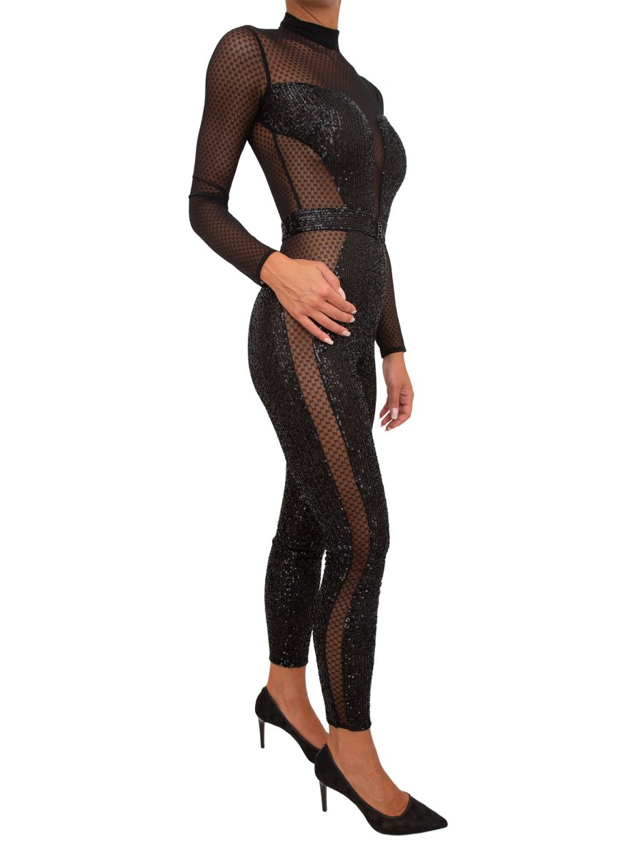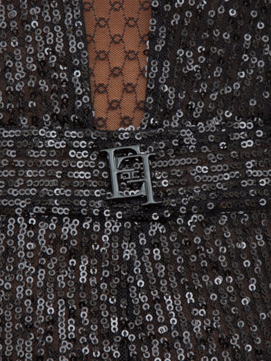 Tuta in paillettes Elisabetta Franchi con pantalone alla caviglia con vestibilità skinny. È caratterizzata da inserti di tulle ricamato sul decolleté e sui fianchi.
