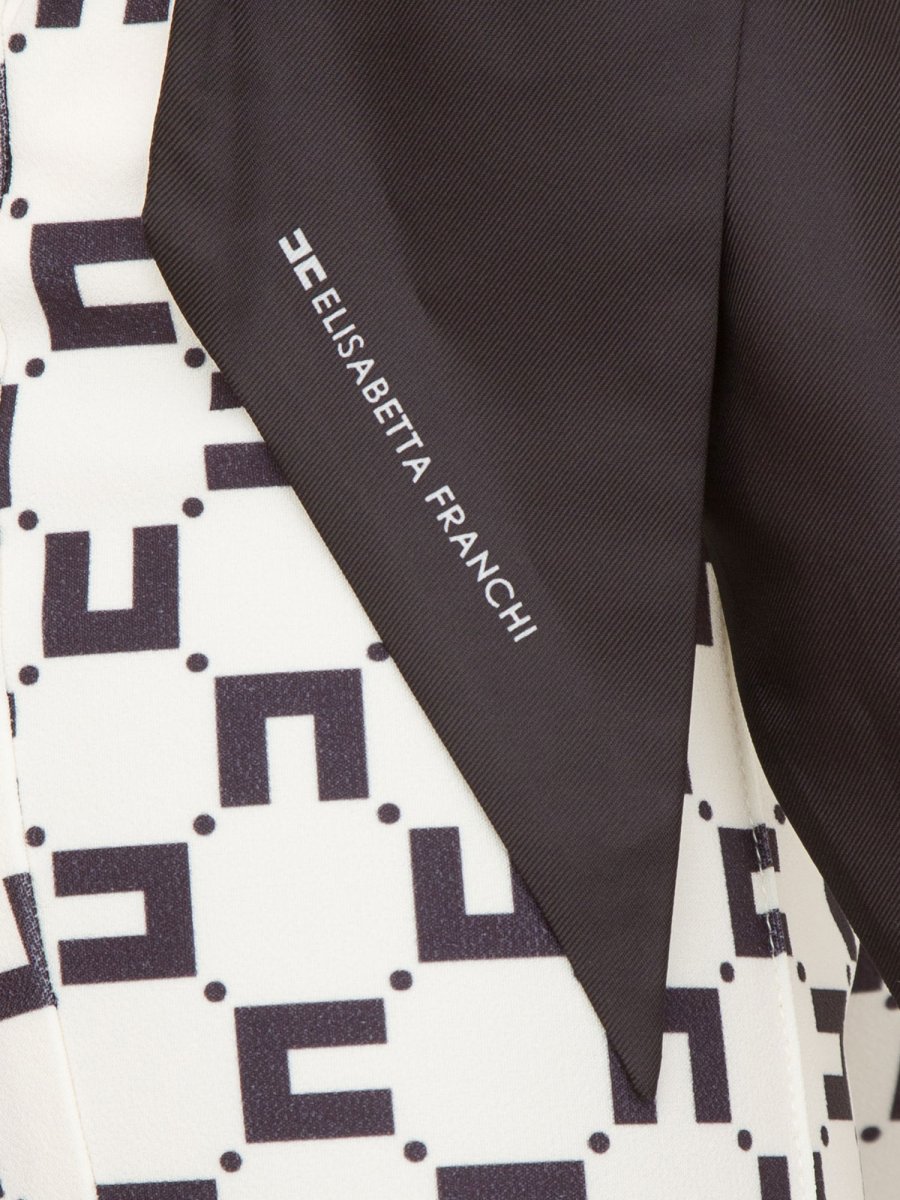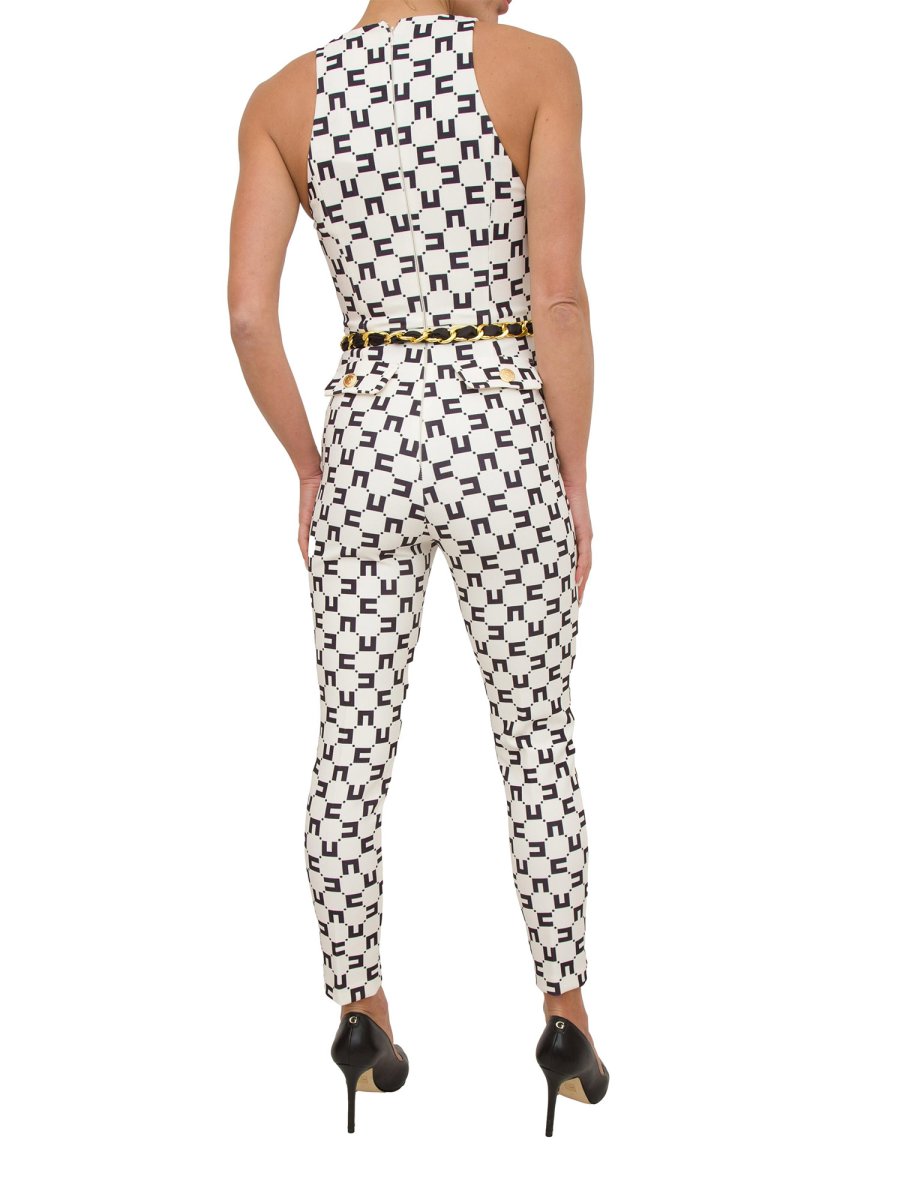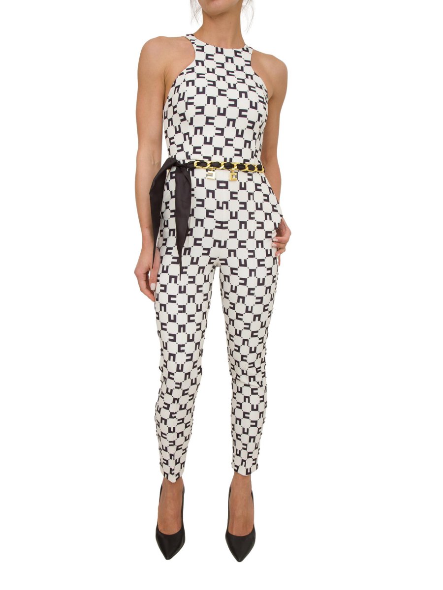 Tuta in doppio crêpe stampa logo con scollo all'americana. Il punto vita è enfatizzato da un accessorio in catena e foulard infilato.