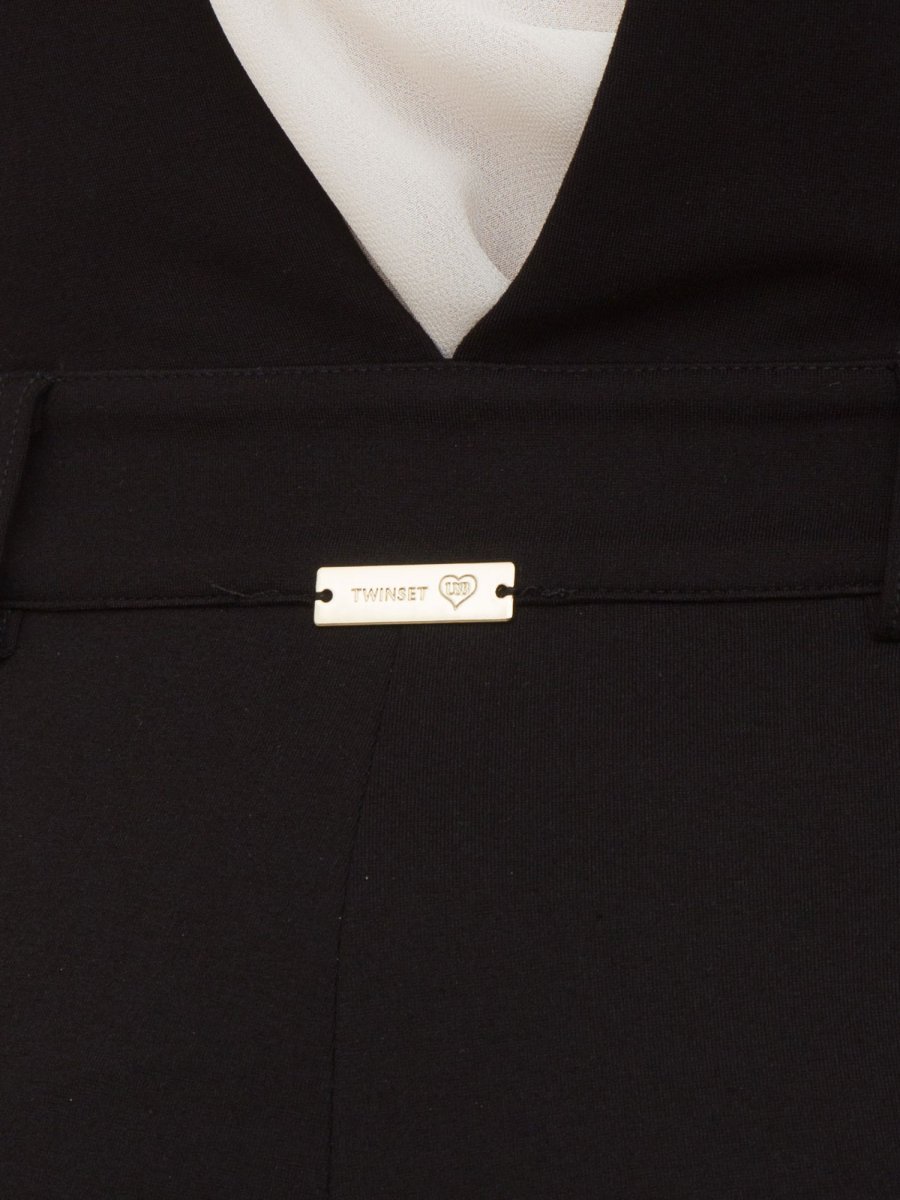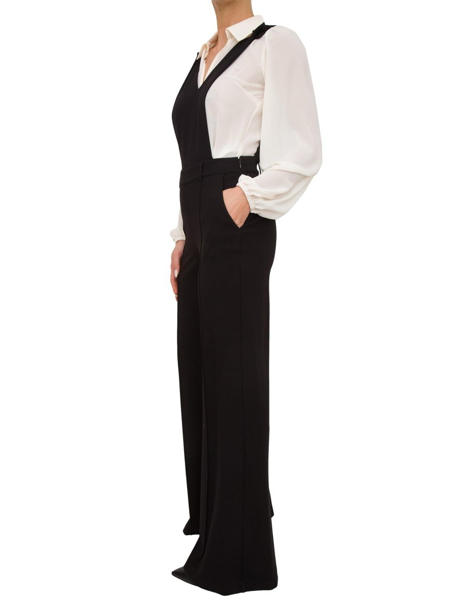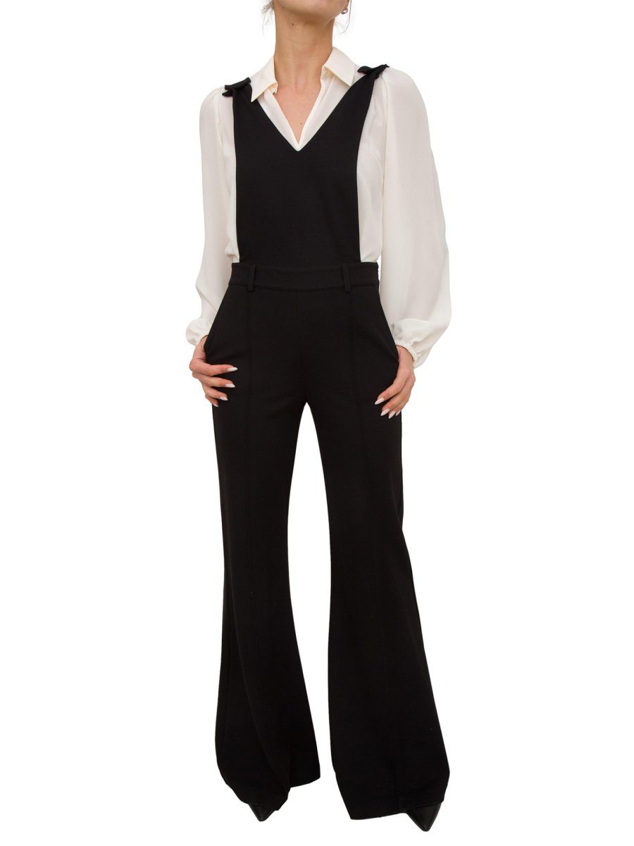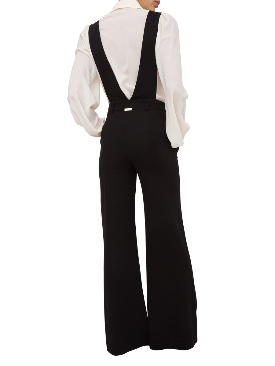 Completo Twinset composto da camicia in georgette a maniche lunghe e tuta in punto Milano con scollatura a V e pantaloni ampi.