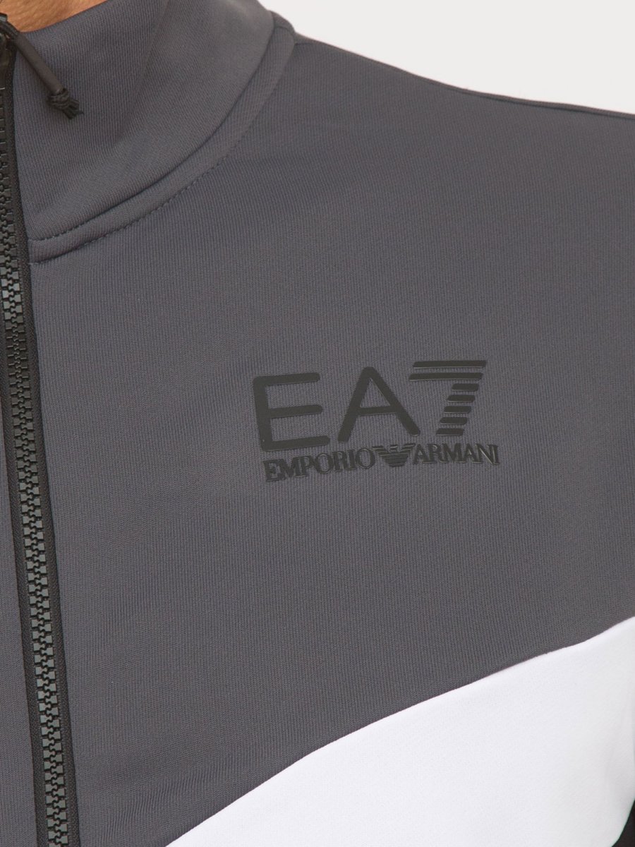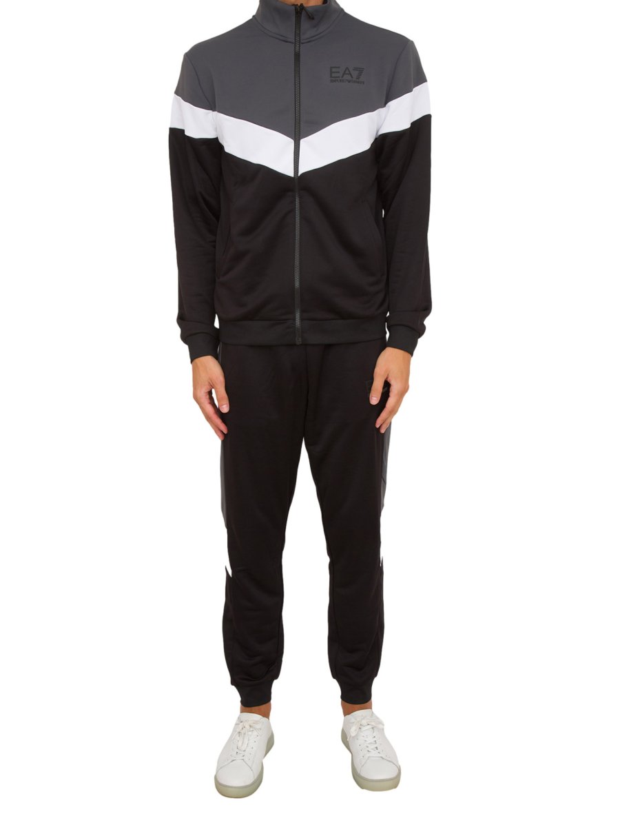 Tuta EA7 uomo in tessuto tecnico, composta da una felpa con zip, due tasche a filetto con zip e un pantalone jogger con coulisse.