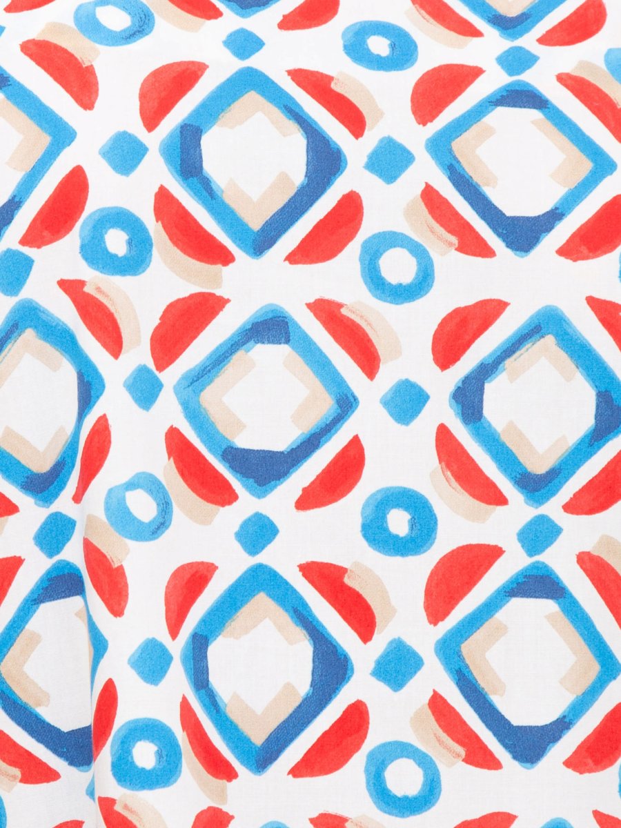 Abito corto Marella in popeline di cotone stretch a fantasia, linea svasata con piega sul fondo. Scollo rotondo, senza maniche con coulisse sulle spalle. Chiusura a goccia con bottone sul retro, tasche inserite sul fianco.