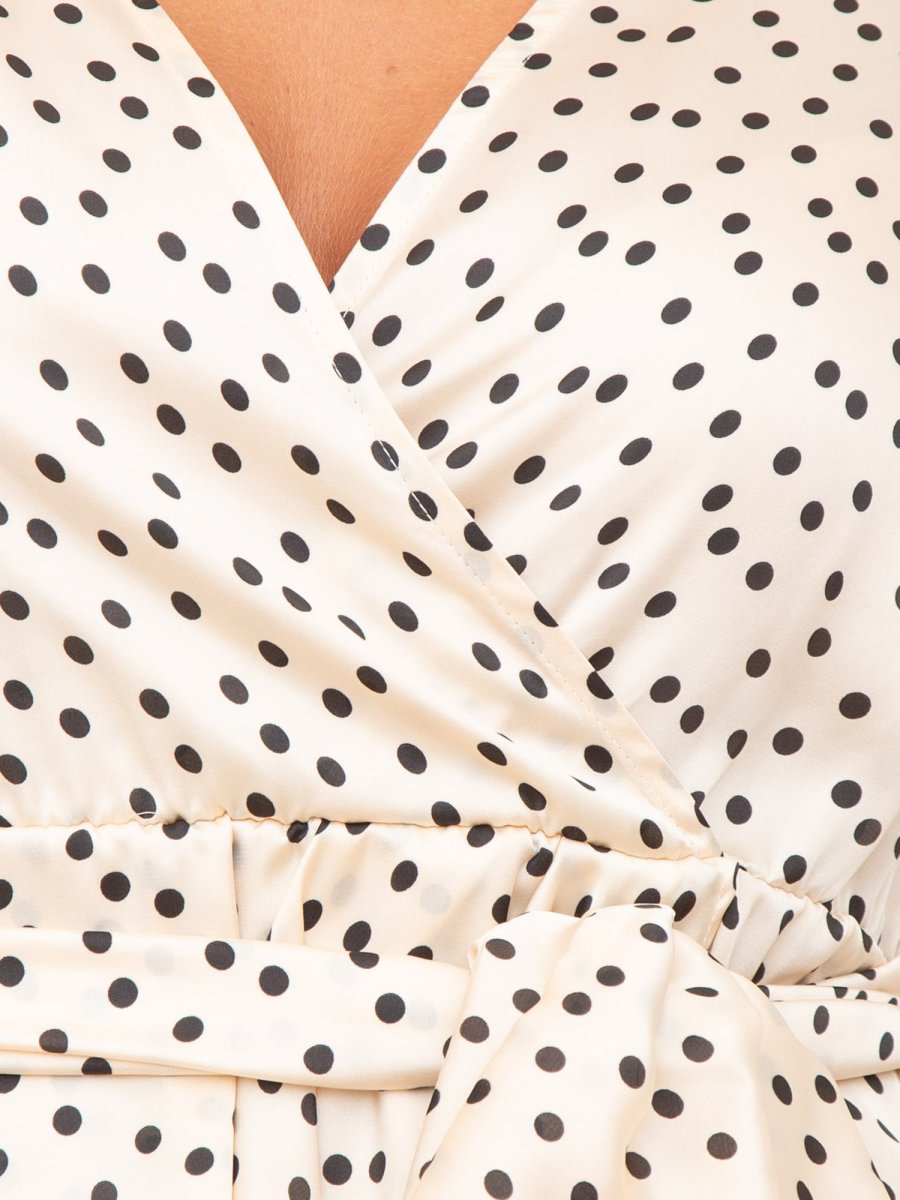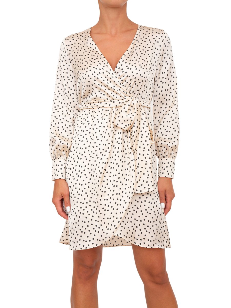 Abito Marella in raso a pois, linea a portafoglio. Scollo a V incrociato, maniche lunghe con polsino. Vita elastica. Cintura coordinata.