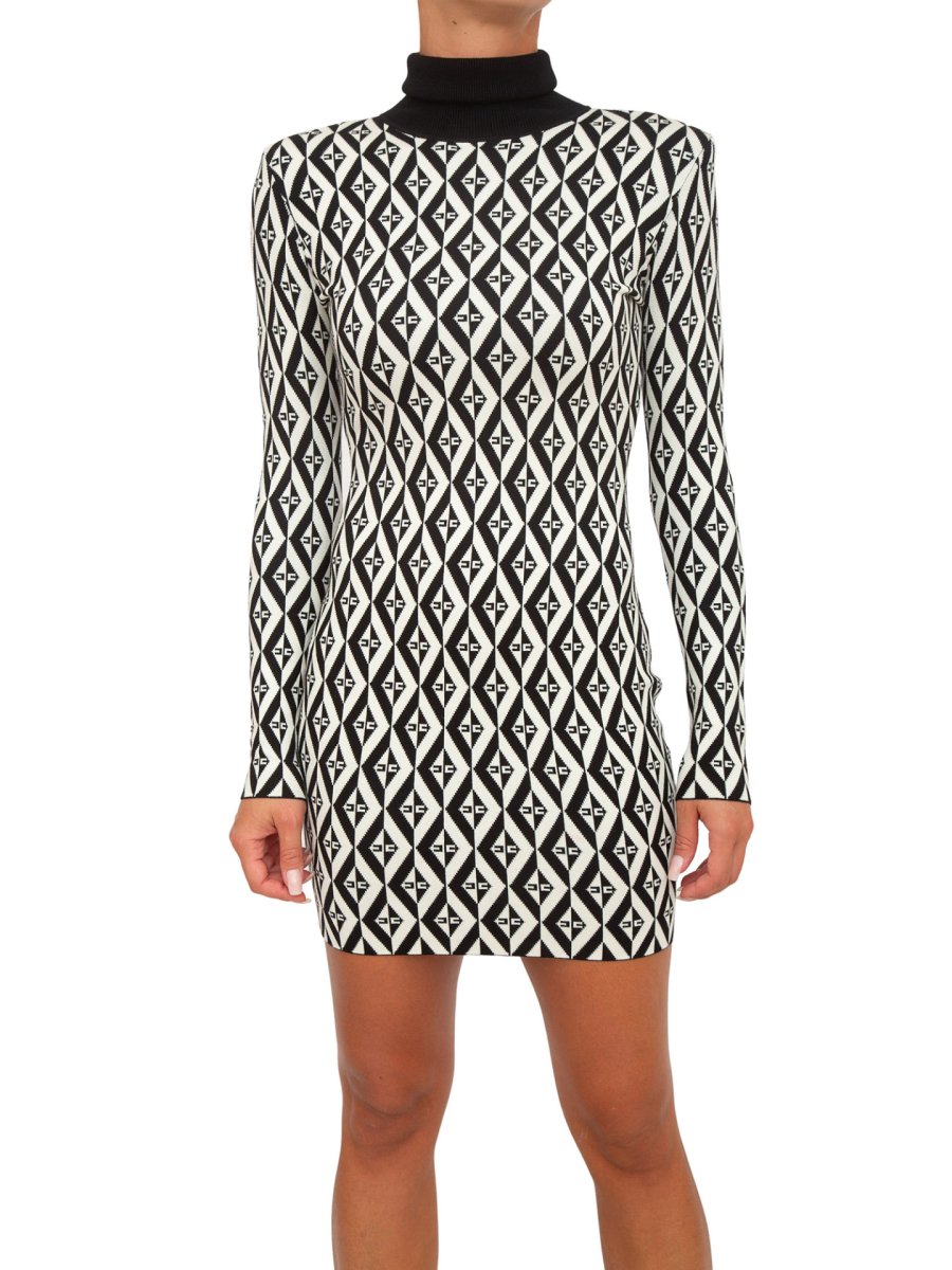Miniabito dolcevita Elisabetta Franchi in jacquard tubico con motivo rombi bicolore all-over con maniche lunghe.