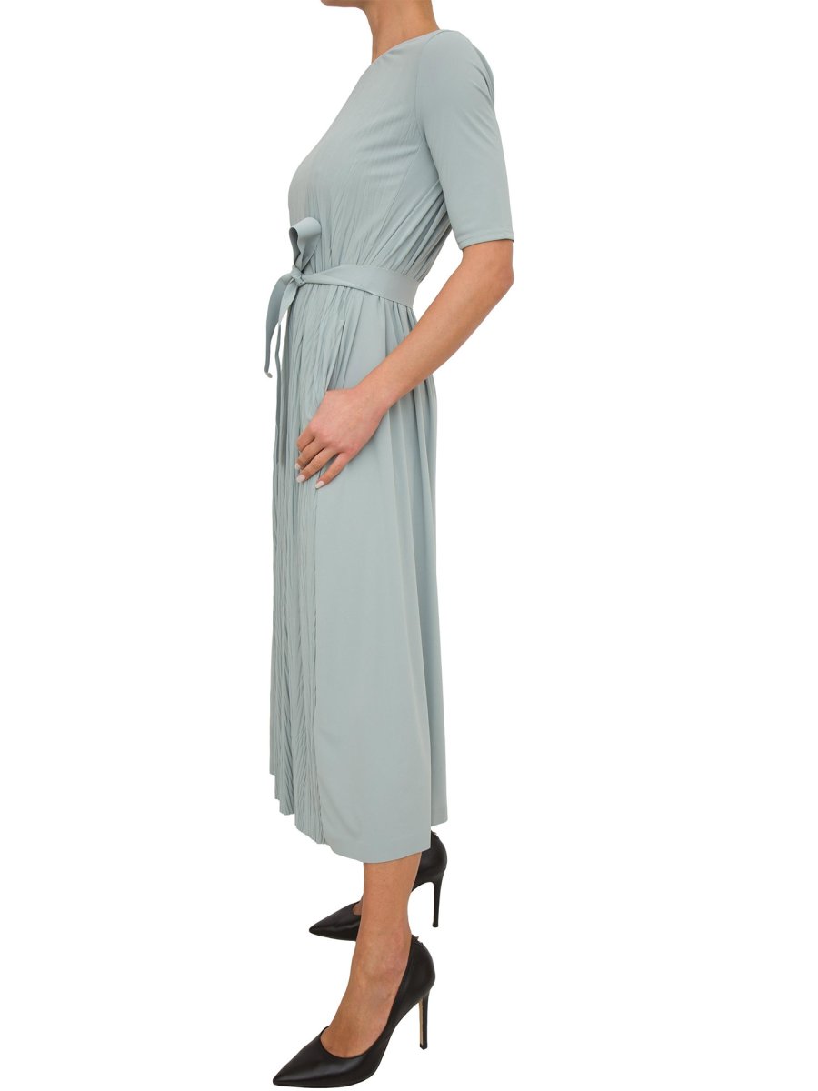 Abito lungo Max Mara in tessuto plissè , maniche lunghe al gomito, tasche e cintura coordinata.