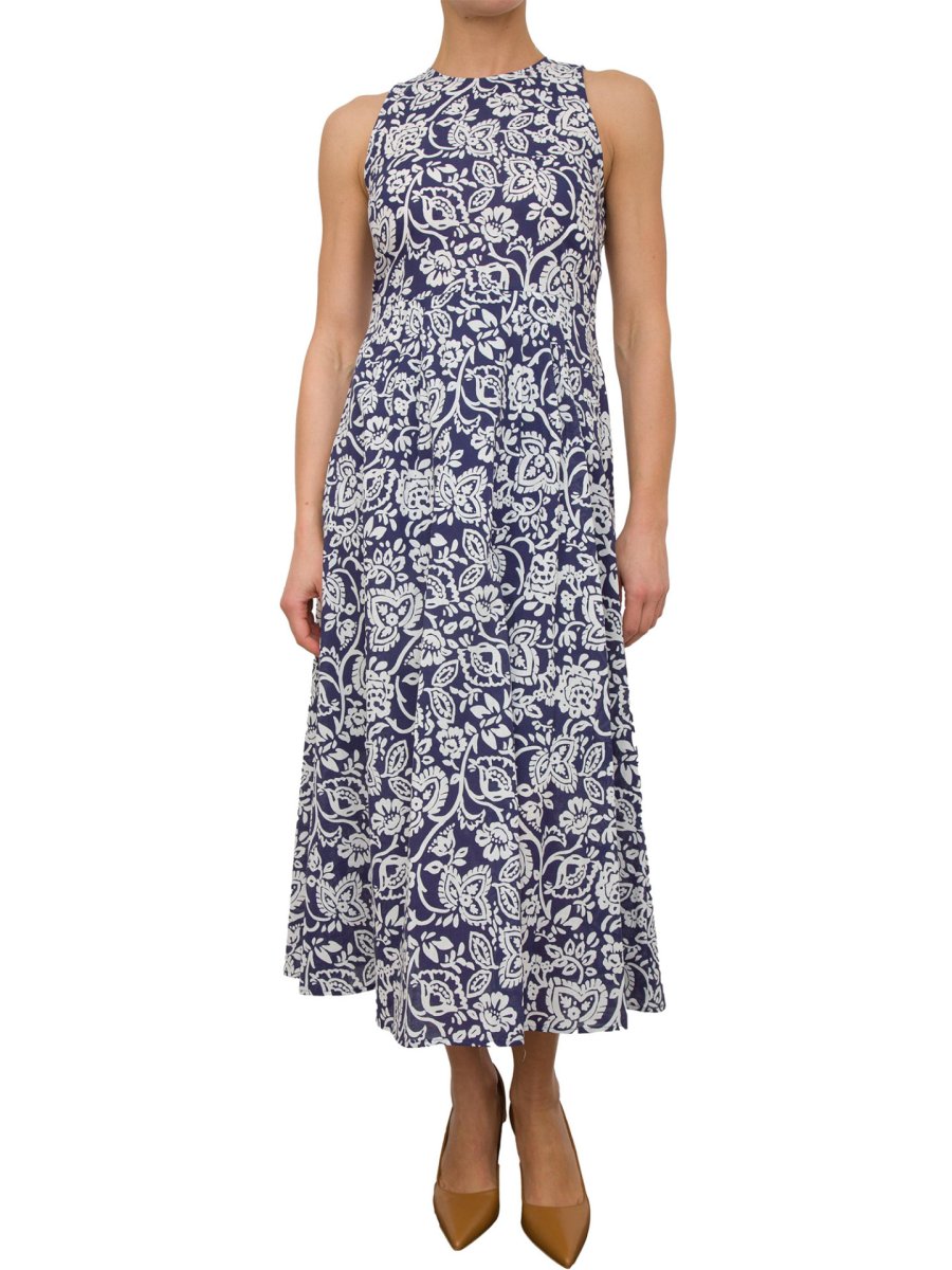 Abito lungo Emme Marella realizzato in fantasia floreale con scollo rotondo senza maniche. Taglio lungo, realizzato in morbido popeline di cotone con gonna a pieghe foderata, è rifinito dalla chiusura con zip invisibile sul retro.