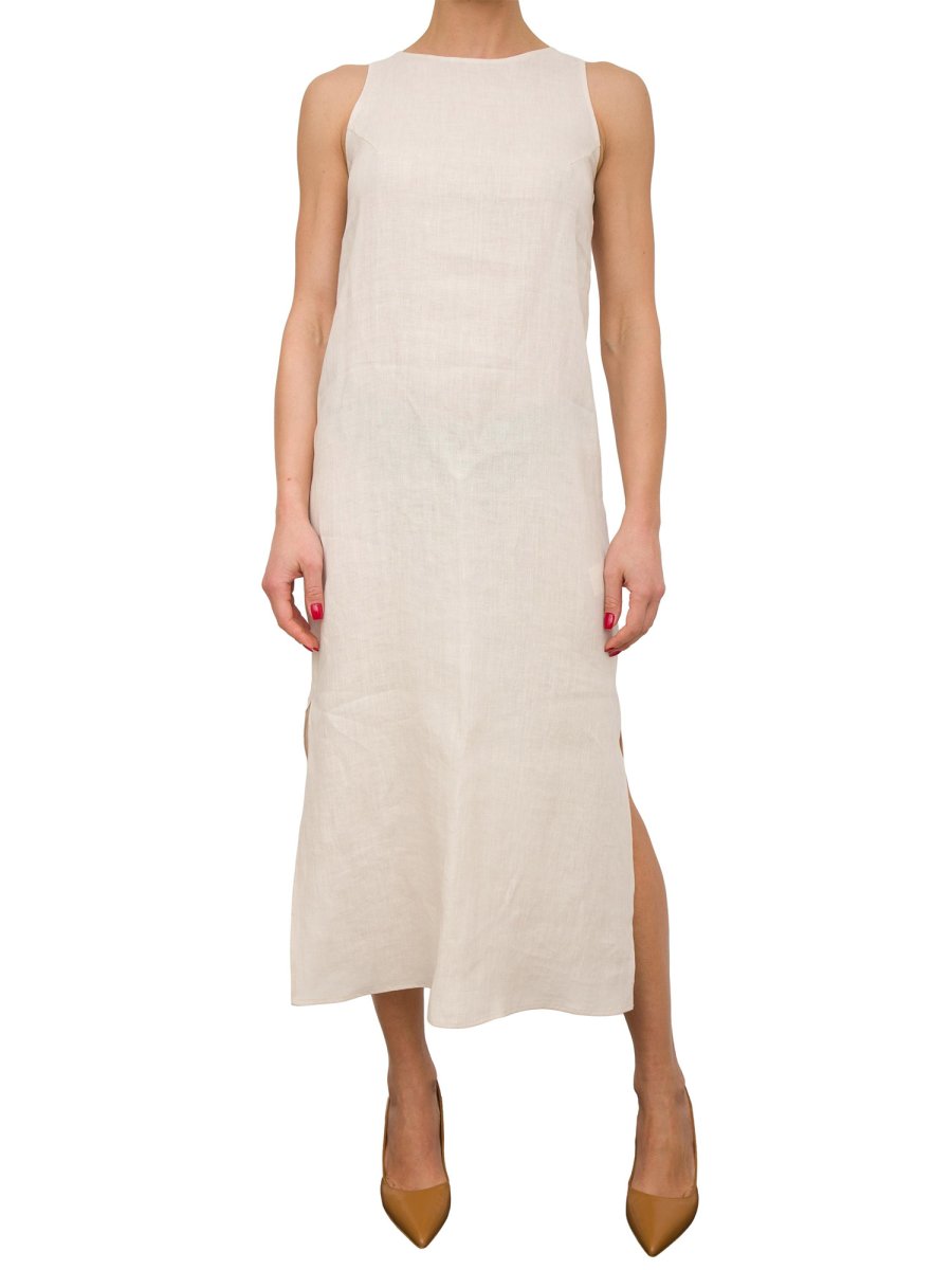 Abito lungo in lino, modello senza maniche con scollo rotondo e spacchi laterali sul fondo. Chiusura con bottone sul retro.