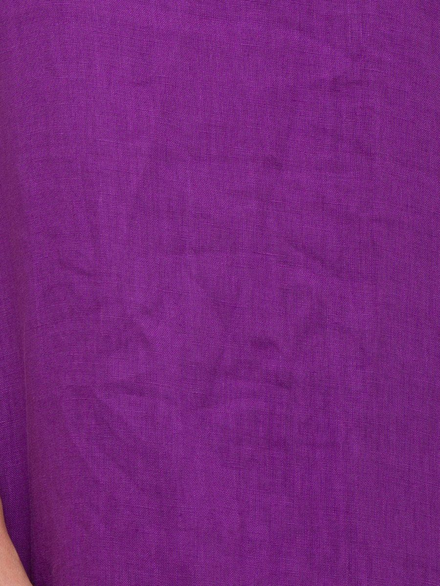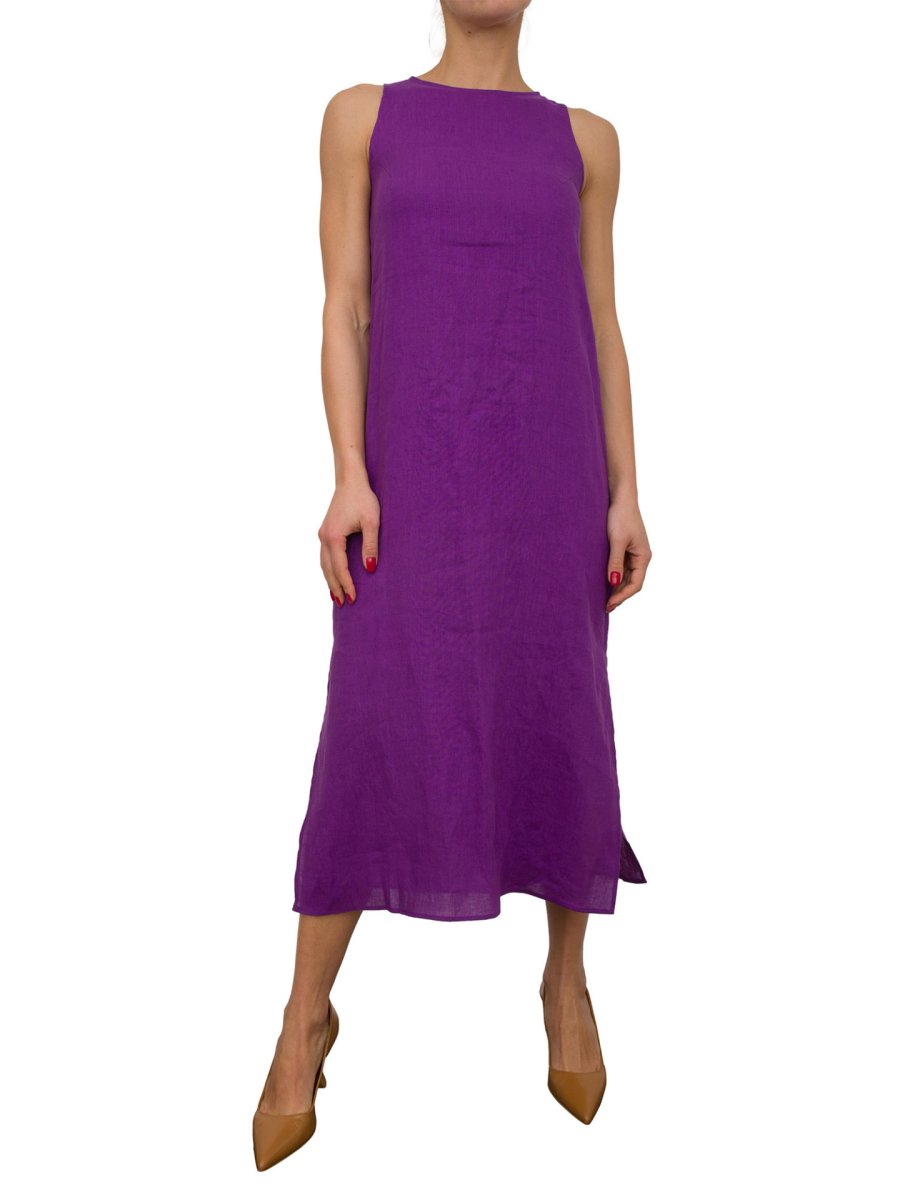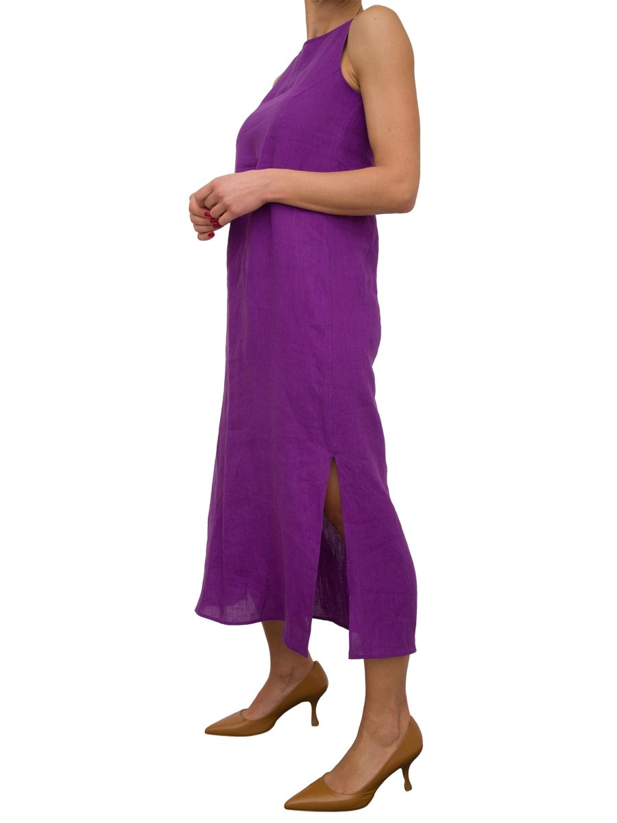 Abito lungo in lino, modello senza maniche con scollo rotondo e spacchi laterali sul fondo. Chiusura con bottone sul retro.